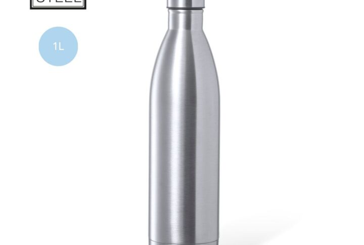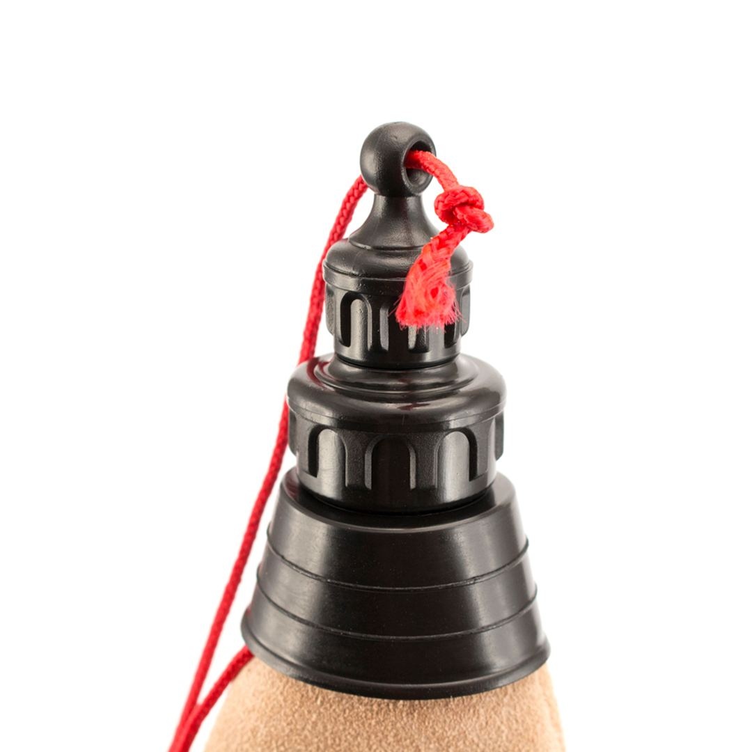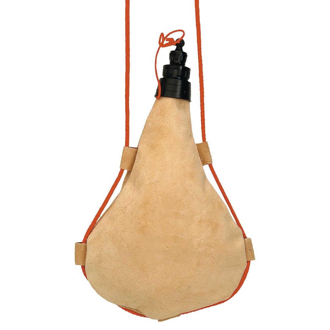 Gourde à vin de 1 litre en croûte de cuir. Avec bouchon de sécurité à vis et bandoulière. Homologuée pour usage alimentaire