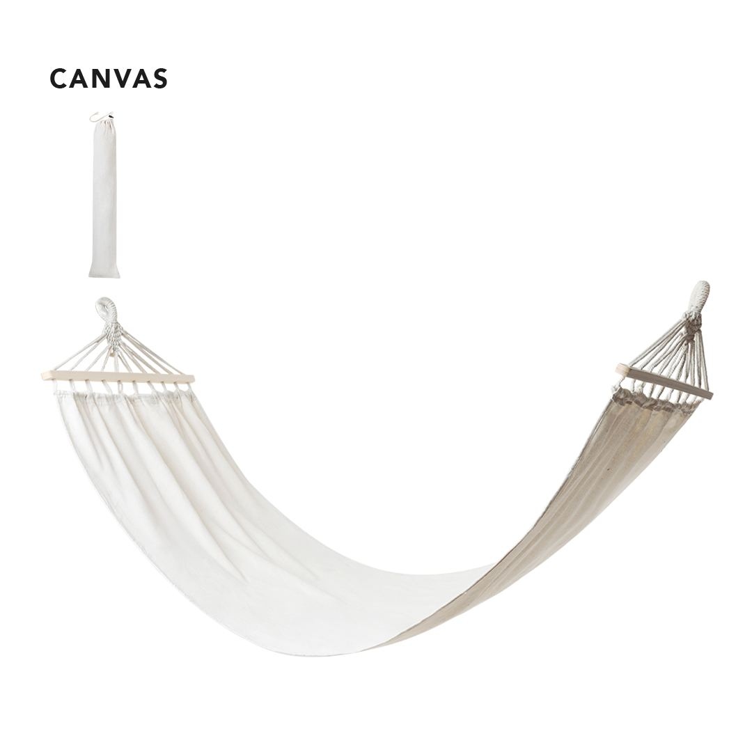 Hamac en toile résistante de 320g/m2 et 190x80cm. Avec des rubans d’amarrage résistants et des supports en bois naturel. Prend en charge jusqu’à 120 kg. Présenté en couverture de toile assortie.
