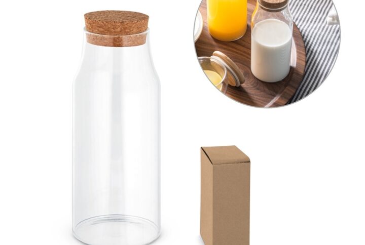 Bouteille en verre borosilicate avec bouchon en liège. Capacité jusqu’à 1 L. Livré dans une boîte cadeau en papier kraft. Le produit étant fabriqué à partir de matériaux naturels, la couleur du produit ainsi que le résultat de l’impression peuvent varier d’un produit à l’autre. ø83 x 215 mm