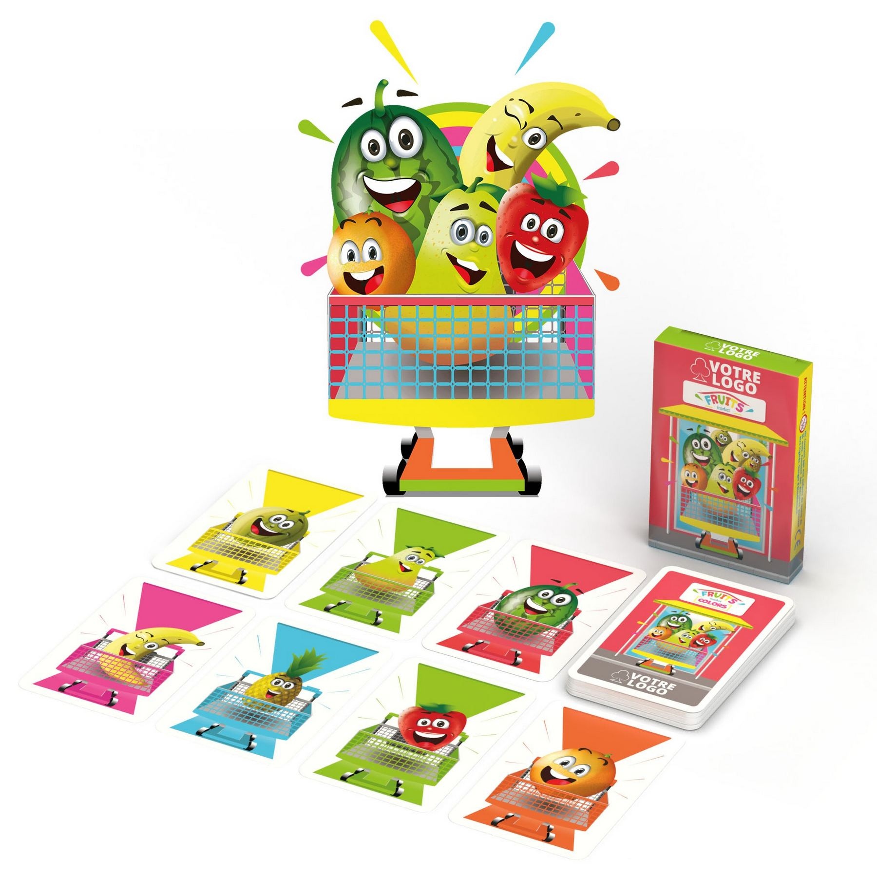 Jeu du type 8 américain sur le thème des fruits au marché, 44 cartes (42 cartes + 1 joker + 1 carte règle), format 58x88mm, personnalisable, coins ronds. Tolérance de fabrication + ou – 5 % appliquée pour la quantité livrable et facturable.