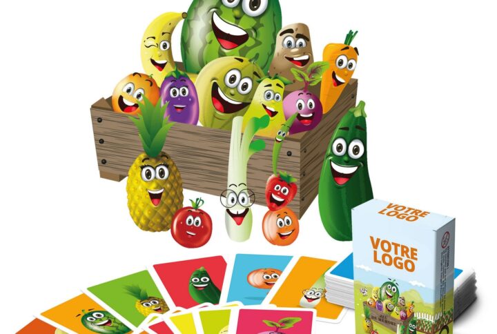 Jeu du type 8 américain sur le thème des fruits au marché, 44 cartes (42 cartes + 1 joker + 1 carte règle), format 58x88mm, personnalisable, coins ronds. Tolérance de fabrication + ou – 5 % appliquée pour la quantité livrable et facturable.