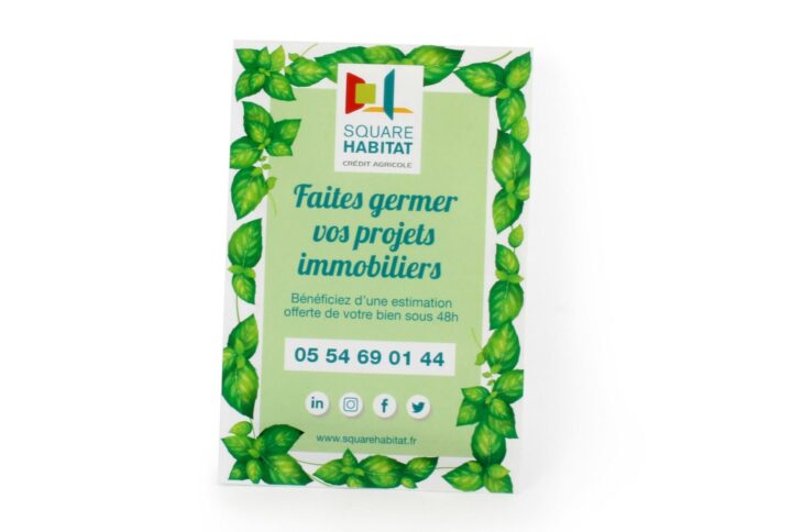 • Sachet graines thermosoudés sur les côtés donc étanche (Papier PE) standard (sans personnalisation) quadri avec au recto le visuel de la variété et au verso la notice