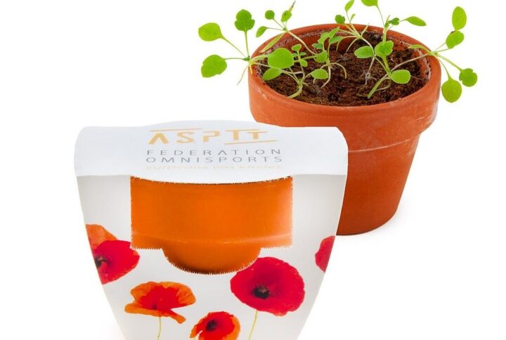 Avec cet objet publicitaire 100% nature, associez votre marque à une image naturelle et créative. Le pot en terre cuite permet de faire pousser une graine de votre choix, tandis que la boîte imprimée, spécialement conçue pour offrir une surface de communication exceptionnelle, se distingue par une fermeture découpée en forme de fleur, de trèfle ou de plante. Ce détail marquera responsablement les esprits, que ce soit pour vos campagnes marketing de grande ampleur ou pour exprimer votre gratitude envers vos clients et collaborateurs.