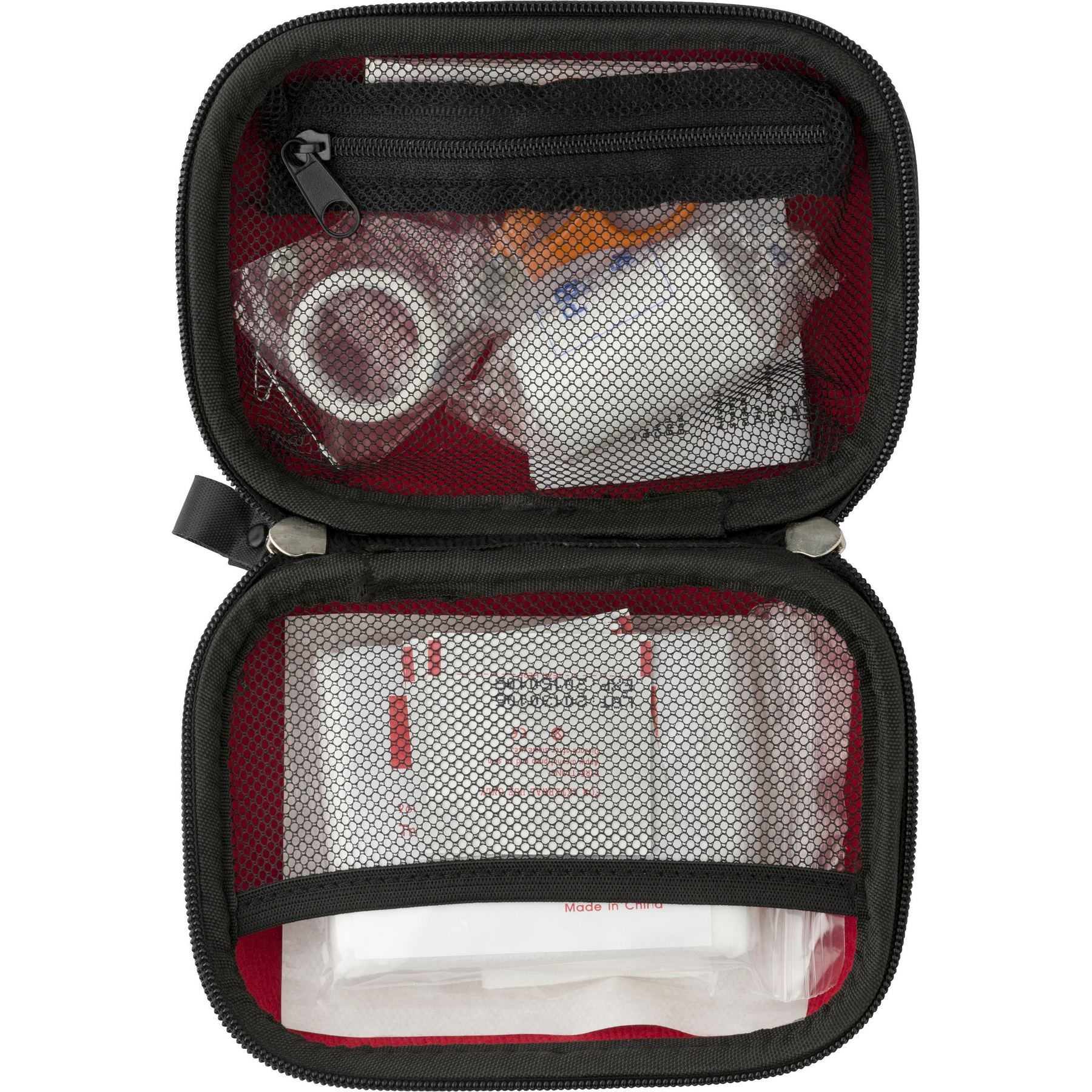 Kit de premiers secours livré dans un étui rigide zippé comprenant bande et lingettes stériles, compresse, pansements, ciseaux, épingles à nourrice et ruban adhésif.