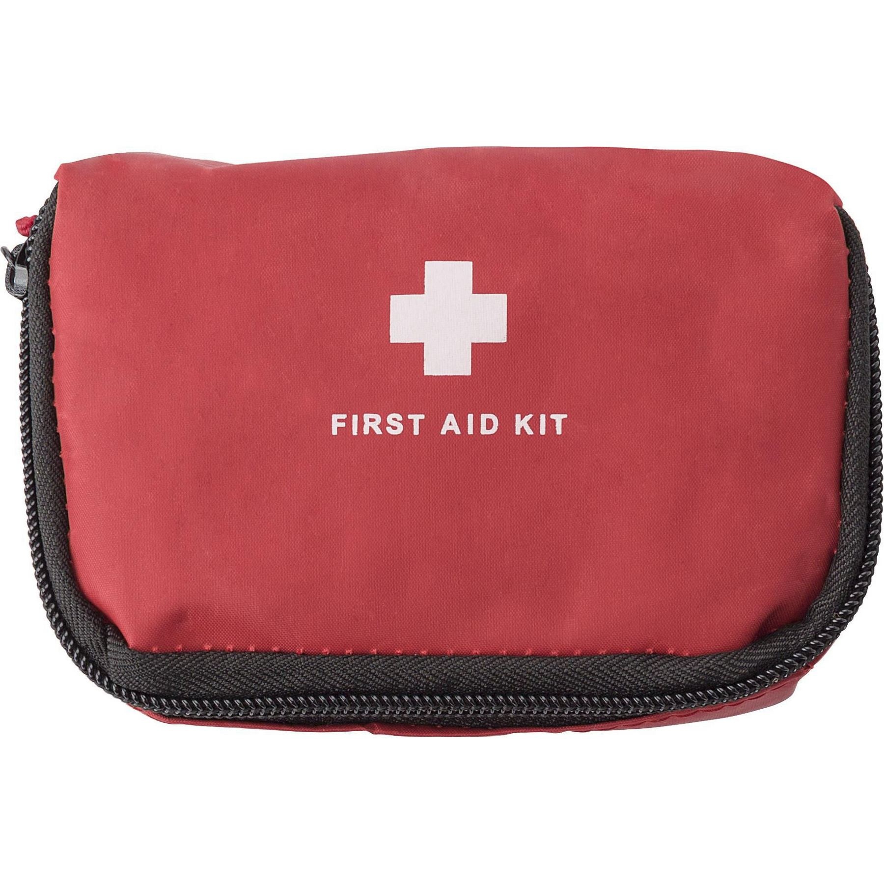 Kit de premiers secours livré dans une pochette zippée en polyester 600D comprenant bandage, une paire de ciseaux, alcool, gaze, compresse.