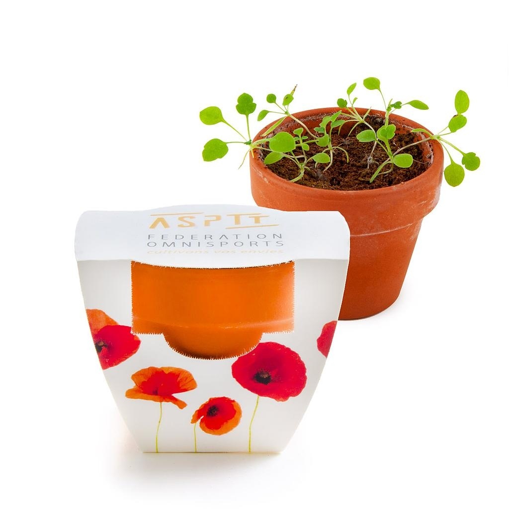 Contenu du Kit : Chaque kit comprend 1 pot en terre cuite de 55 mm, 1 terre de coco, 1 sachet de graines communes, le tout soigneusement entouré d’un fourreau entièrement personnalisable pour mettre en avant votre communication.