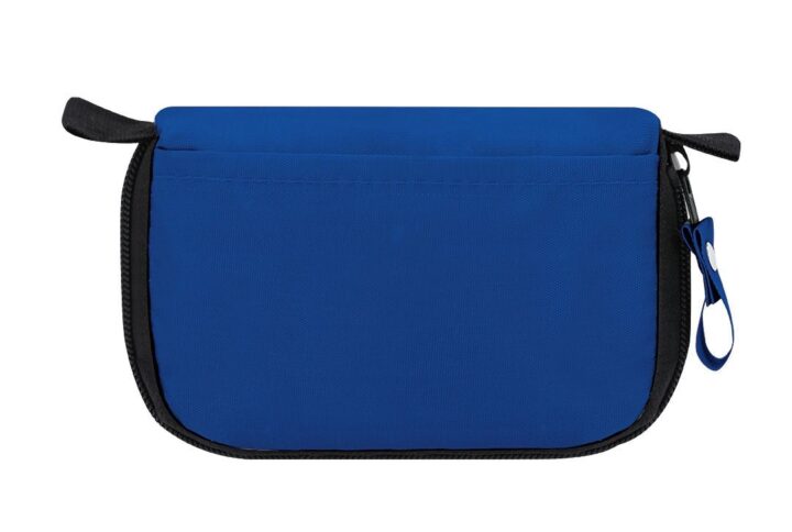 Kit d’urgence de 14 accessoires dans un étui résistant en polyester 600D, avec fermeture éclair, poche frontale et mousqueton métallique. Inclut des bandages, des lingettes, des serviettes avec alcool et une lingette soulageant les piqûres.
