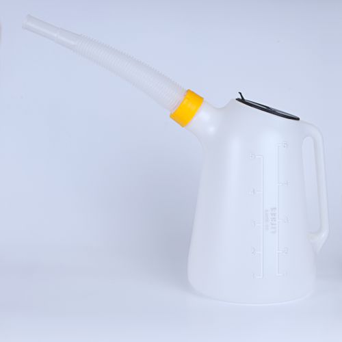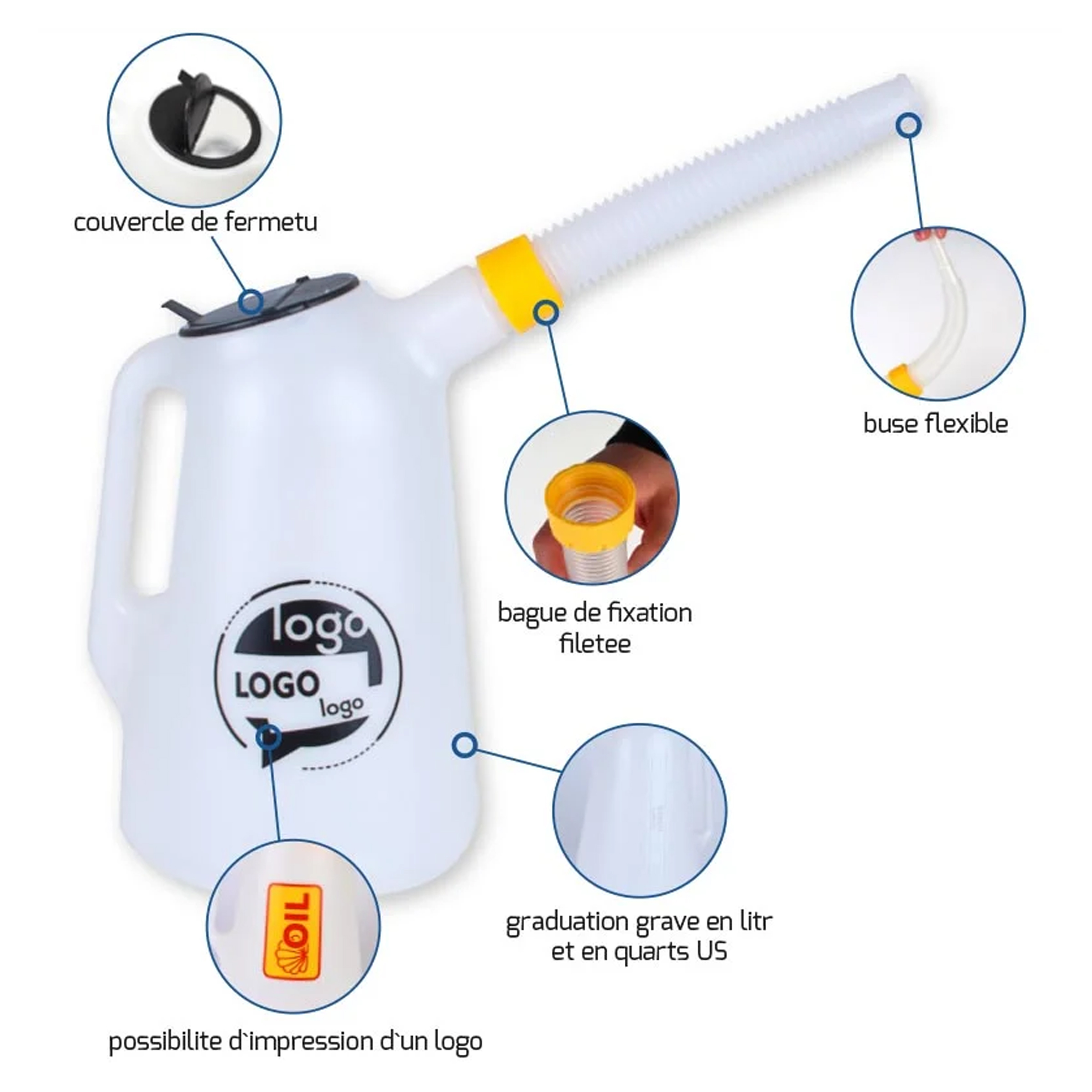 Bidon à huile résistant aux acides avec échelle graduée en relief en litres et en quart. Pratique à utiliser, il a un bec flexible et un couvercle. Contenance 5 litres
