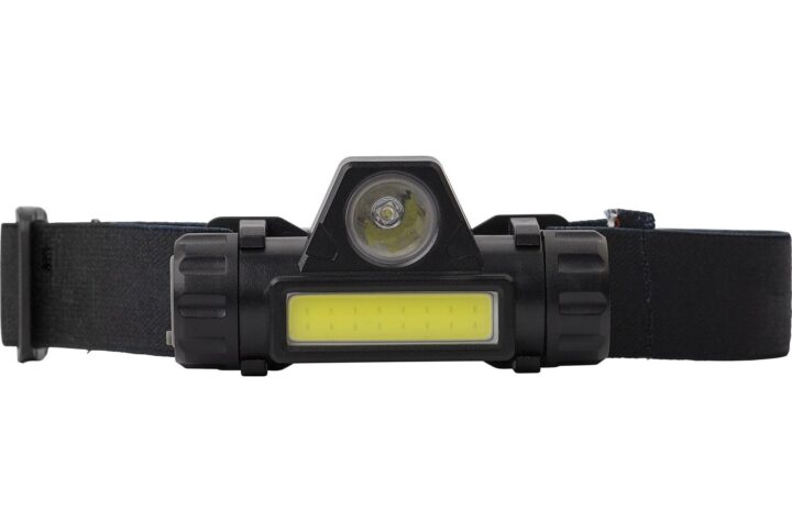 Lampe frontale en polyester avec 3 modes d”intensité lumineuse et sangle réglable, piles incluses.