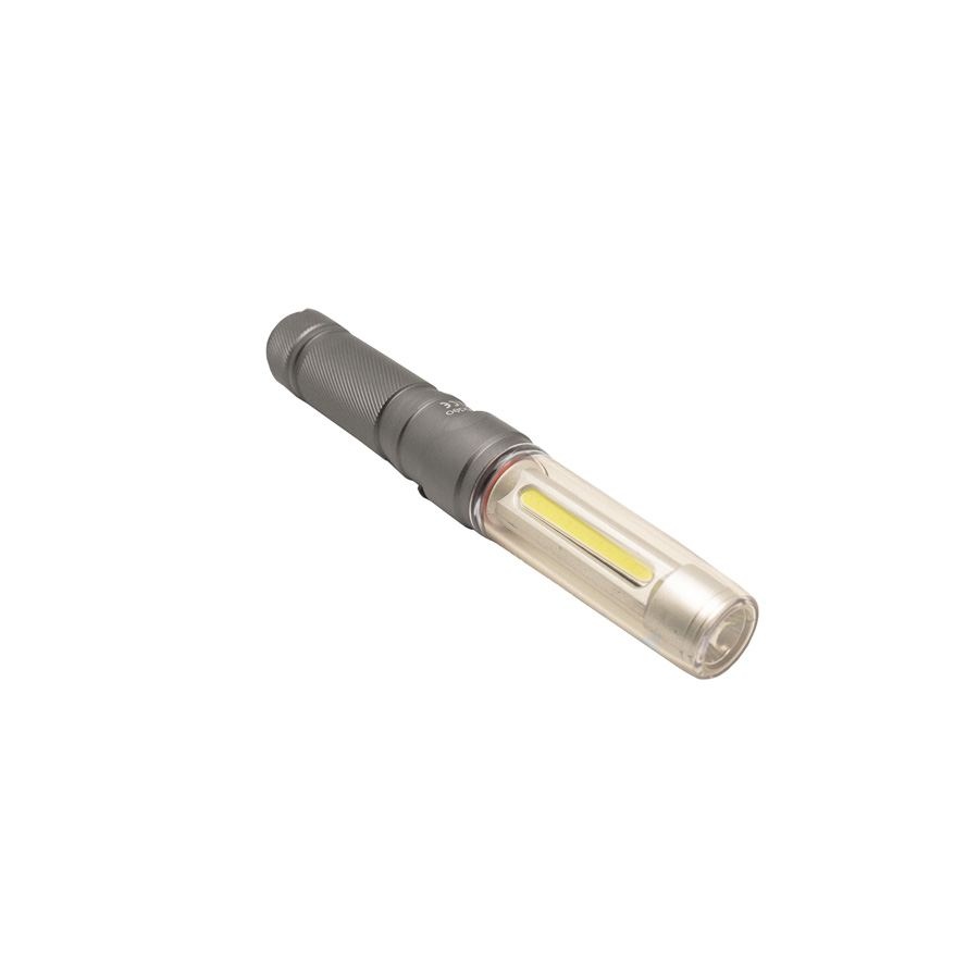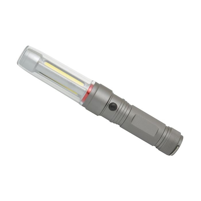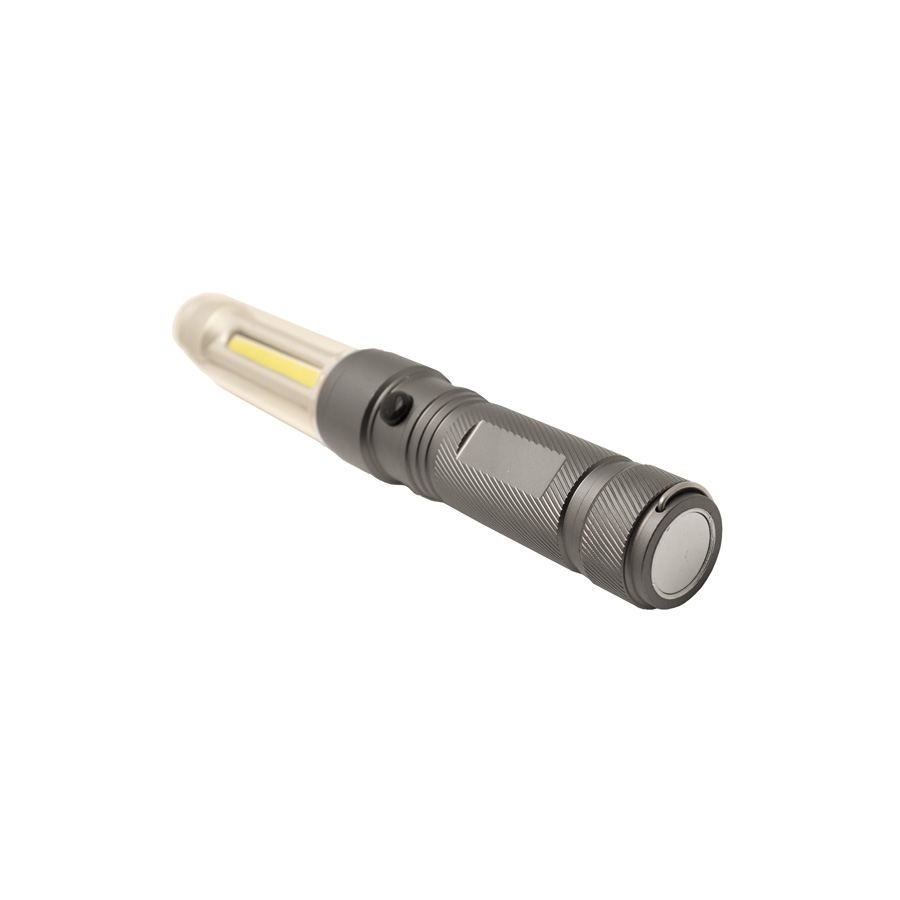 Manche en aluminium anodisé. 2 fonctions avec en tout 3 modes d’éclairage : Lampe torche LED ou lanterne COB (Blanc ou rouge clignotant). Puissant aimant à l’arrière de la lampe. Anneau de suspension. Fonctionne avec 3 piles AAA (fournies). Puissance de la LED : 3W (220 lumens). Longueur du faisceau : 20m. Niveau d’étanchéité : IPX-4.