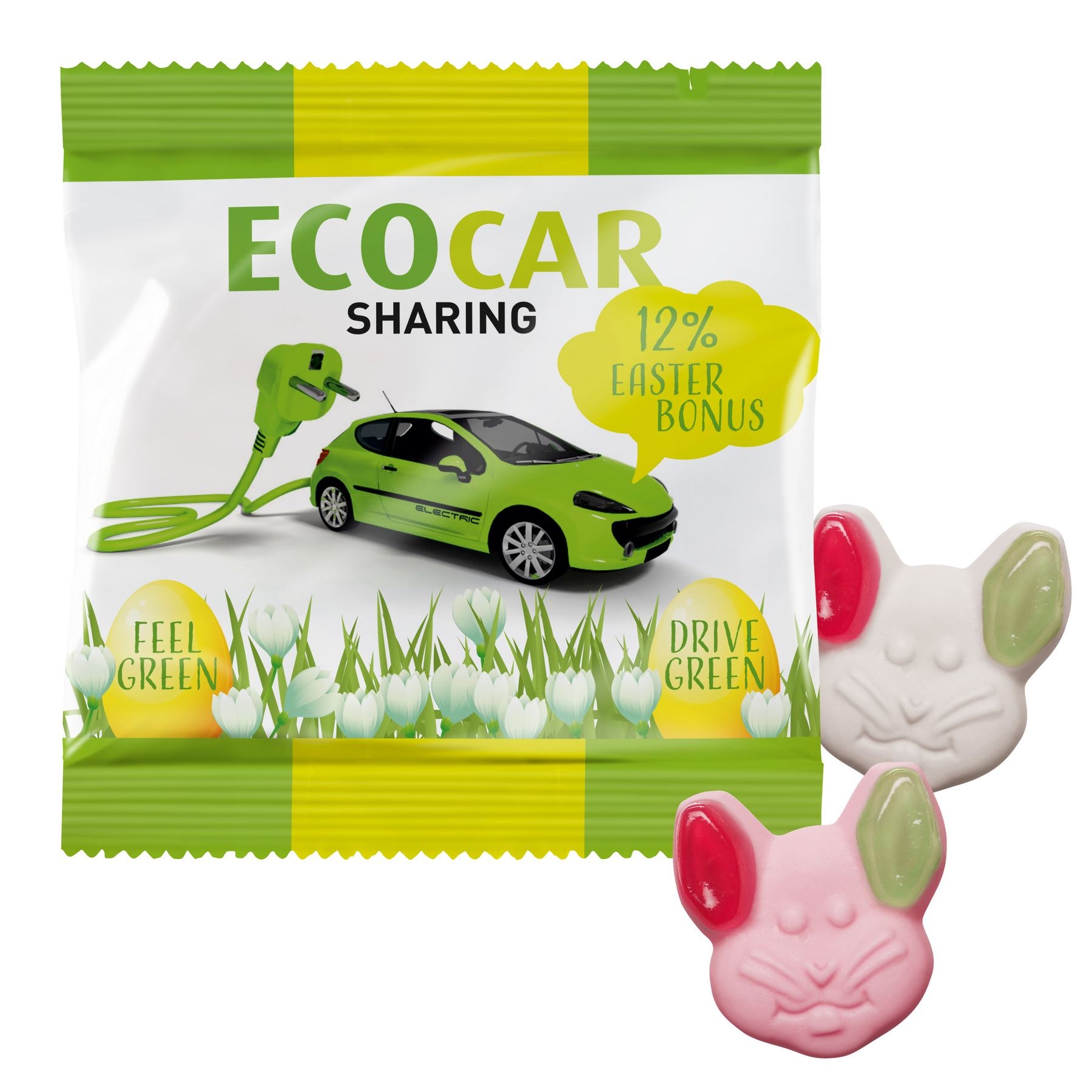 Ces petits lapins aux oreilles vertes ont un nom qui en dit long et constituent de délicieuses friandises végétaliennes ! L’oreille verte est au goût de fraise et l’oreille rouge au goût de cassis. Les lapins roses en guimauve sont délicieusement parfumés à la framboise, tandis que les lapins blancs son parfümés à la cerise. Le tout à partir d’arômes et de couleurs naturels et en sachet transparent ou blanc, laminage mat ou brillant.