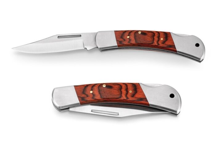 Canif en acier inoxydable et bois avec fermeture de sécurité et clip. 115 x 16 x 36 mm
