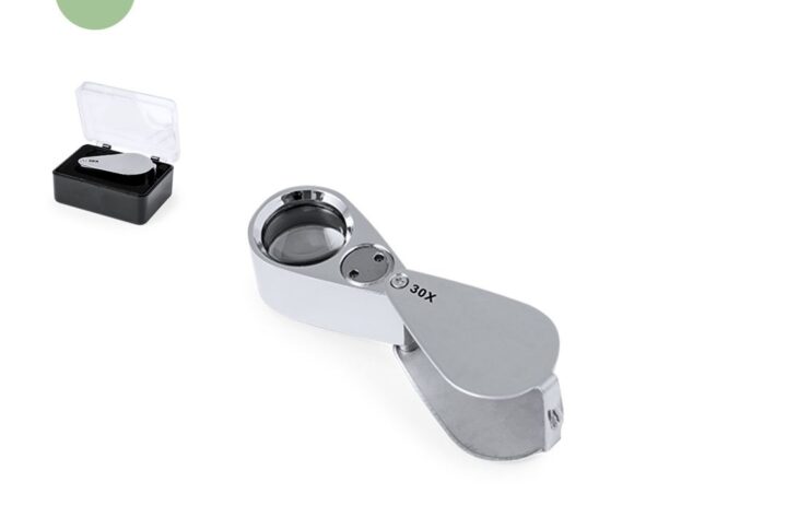 Loupe pliante double avec grossissement 30x, fabriquée en métal résistant. Avec des lampes LED intégrées et une grande puissance d’agrandissement pour une vision très proche des plus petits détails et un agrandissement sans distorsion. Idéal pour l’inspection des objets de taille réduite, du texte, etc. En outre, il a un accessoire à accrocher, et il est placé dans un boîtier avec un intérieur rembourré pour une meilleure protection. Alimentation par piles (bouton inclus), avec clé spéciale pour les remplacer lorsqu’elles sont épuisées. Présentée dans une boîte en carton noir.
