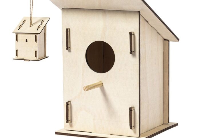 Maisonnette suspendue pour oiseaux fabriquée en bois naturel. Inclut un pinceau et des peintures à base d’eau dans différentes couleurs.