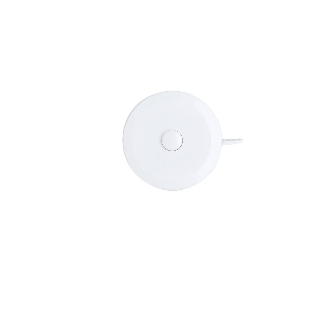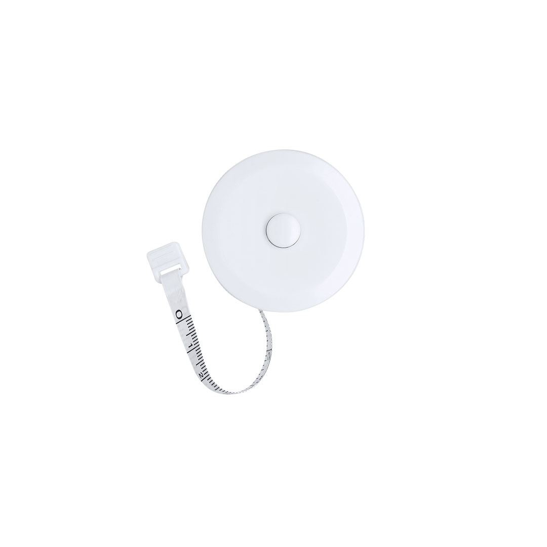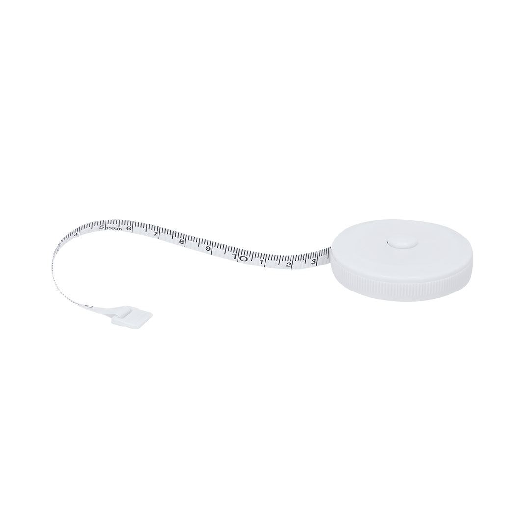 Ruban à mesurer en PVC de 150cm de long et mécanisme rétractable avec bouton d’arrêt. Échelle imprimée en noir en cm et pouces.