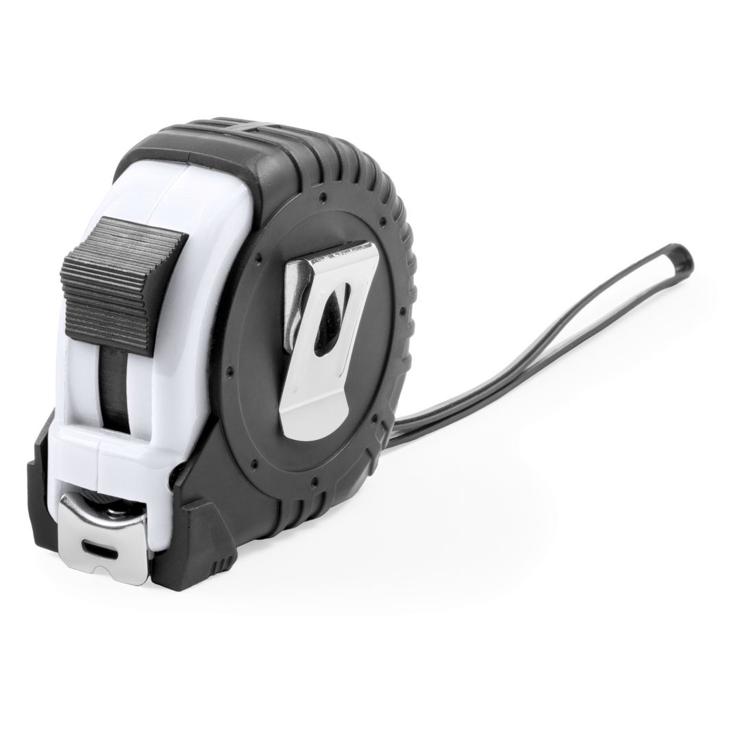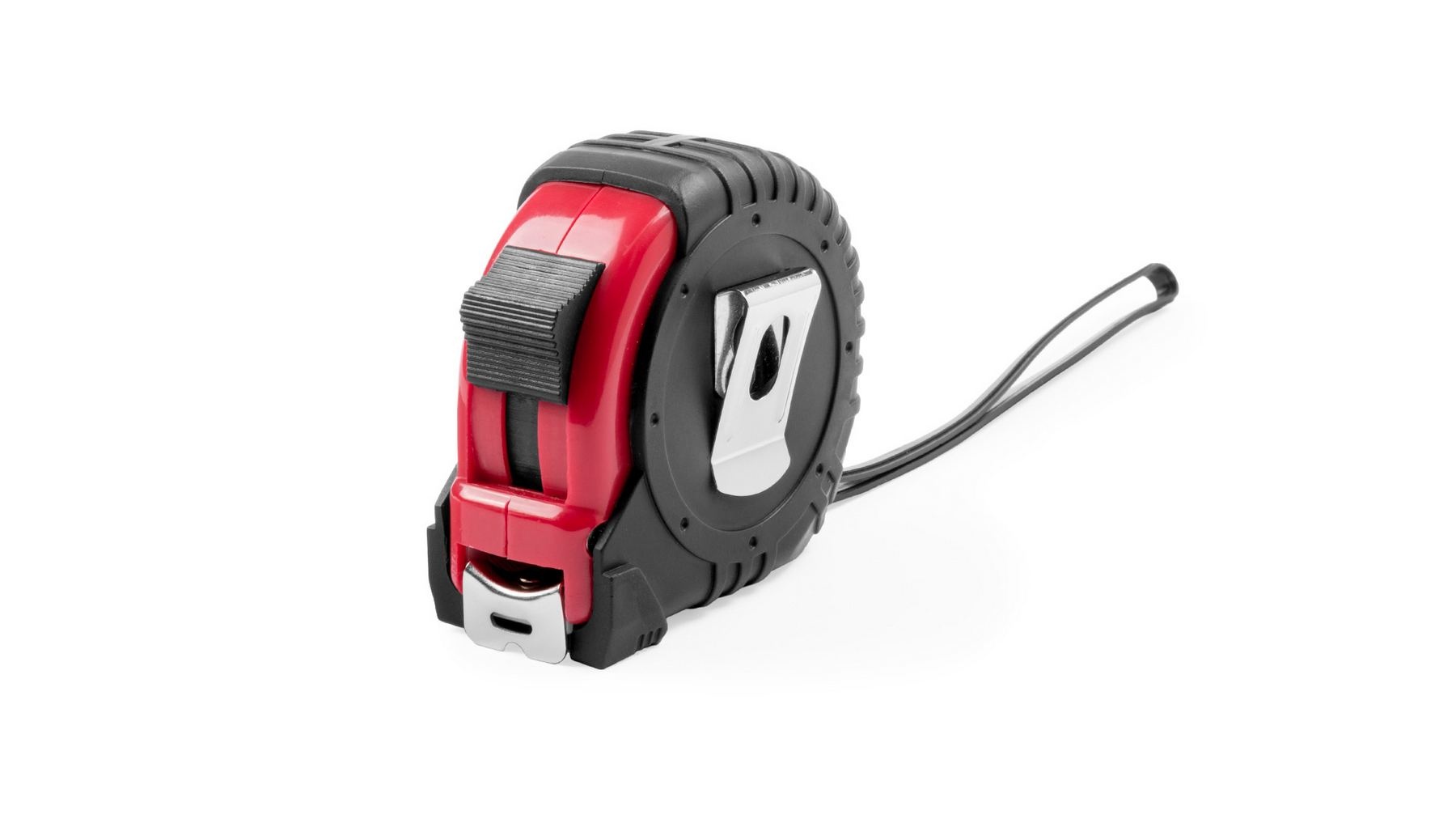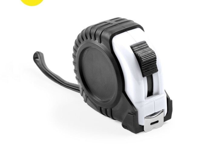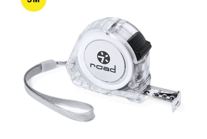 Mètre ruban de 5 mètres avec lame métallique et mécanisme de verrouillage. Corps au toucher doux disponible en différentes couleurs. Revêtement protecteur en gomme résistante, clip métallique pour ceinture et sangle de transport. Avec découpe spéciale pour le marquage en Doming. Livré dans une boîte individuelle.