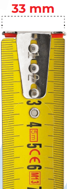 Ruban largeur 33 mm revêtu en nylon. Longue durée, anti-abrasion, anti-acide et anti-reflet. Rigidité exceptionnelle: jusqu’à 3 m en horizontal et 4,5 m en vertical. Crochet spécial mobile revêtu en caoutchouc à l’intérieur pour augmenter la prise (breveté). Chiffres géants pour une lecture plus facile. Boîtier en bi-matériel en acier inox revêtu en caoutchouc anti-glissement. Rentrée automatique du ruban amortie. Avec clip