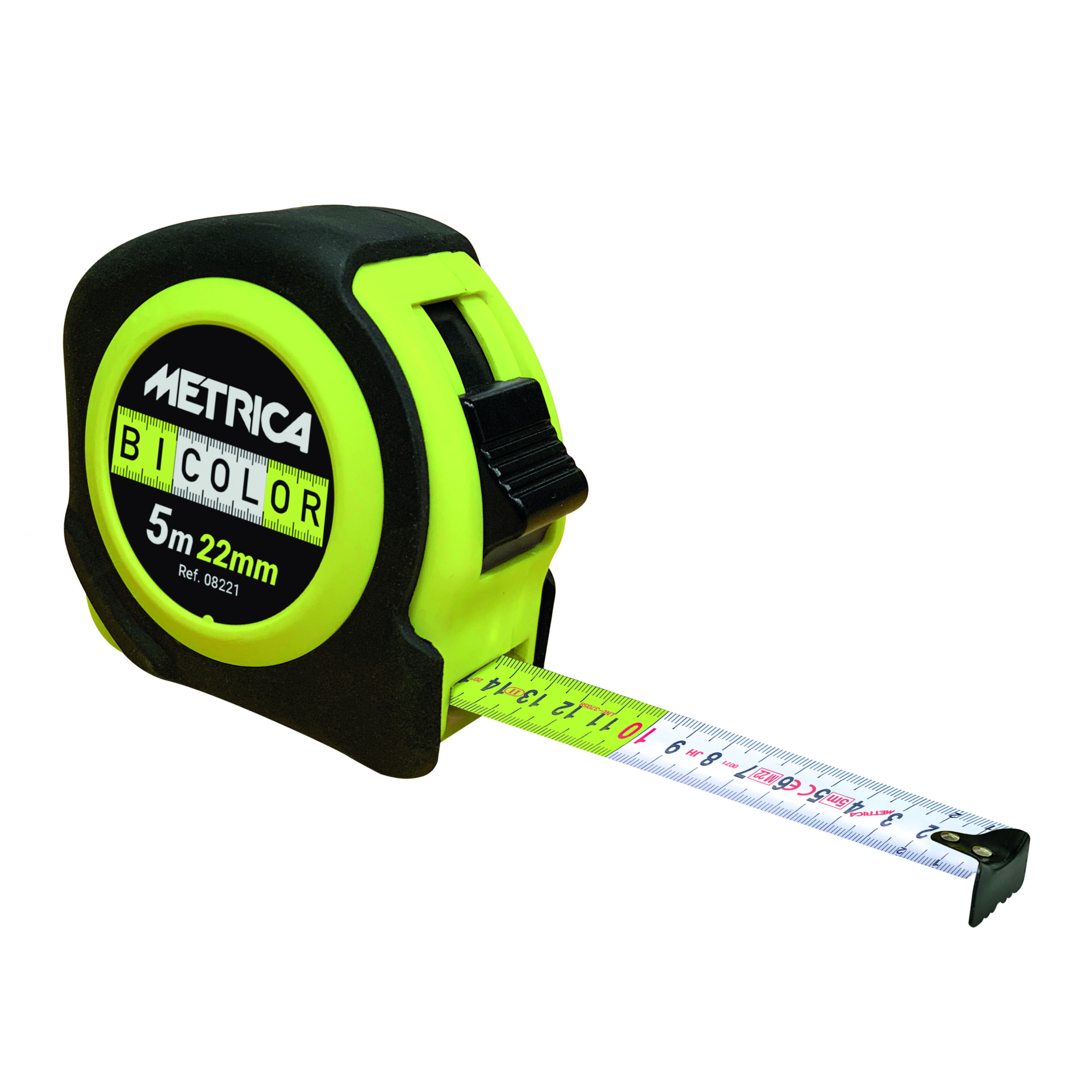 Boîtier ABS caoutchouté anti-choc – jaune fluo et noir. Ruban breveté avec changement de couleur tout les 10 cm sur 2 mètres pour une visibilité instantanée et facilitée. Numérotation agrandie et visible. Largeur du ruban augmentée pour plus de stabilité (jusqu’à 3m en horizontal en largeur 28mm). Existe aussi en 3 m x 19 mm / 5 m x 22 mm / 5 m x 28 mm