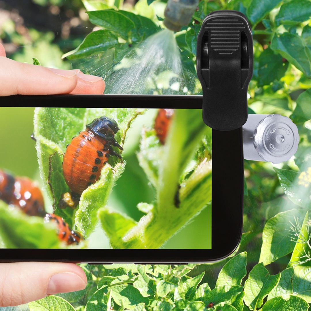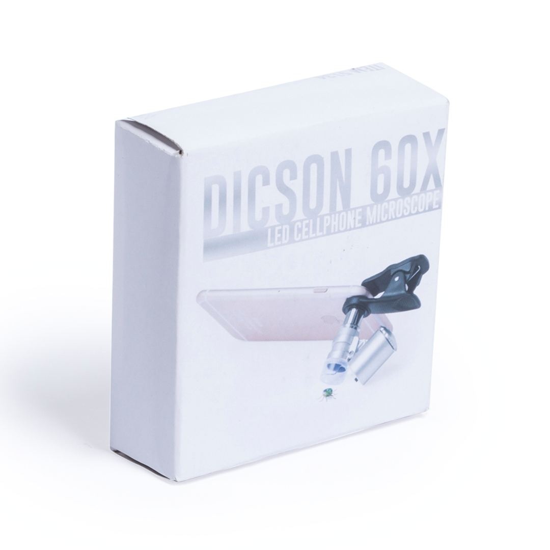 Microscope pour smartphone ajustable à la caméra par clip. Avec lentilles grossissantes jusqu´à 60x, 2 LED et lumière ultraviolette pour un grossissement maximum. Piles boutons incluses. Présenté dans une élégante housse en similicuir et un petit sac en tissu, le tout dans un élégant coffret.