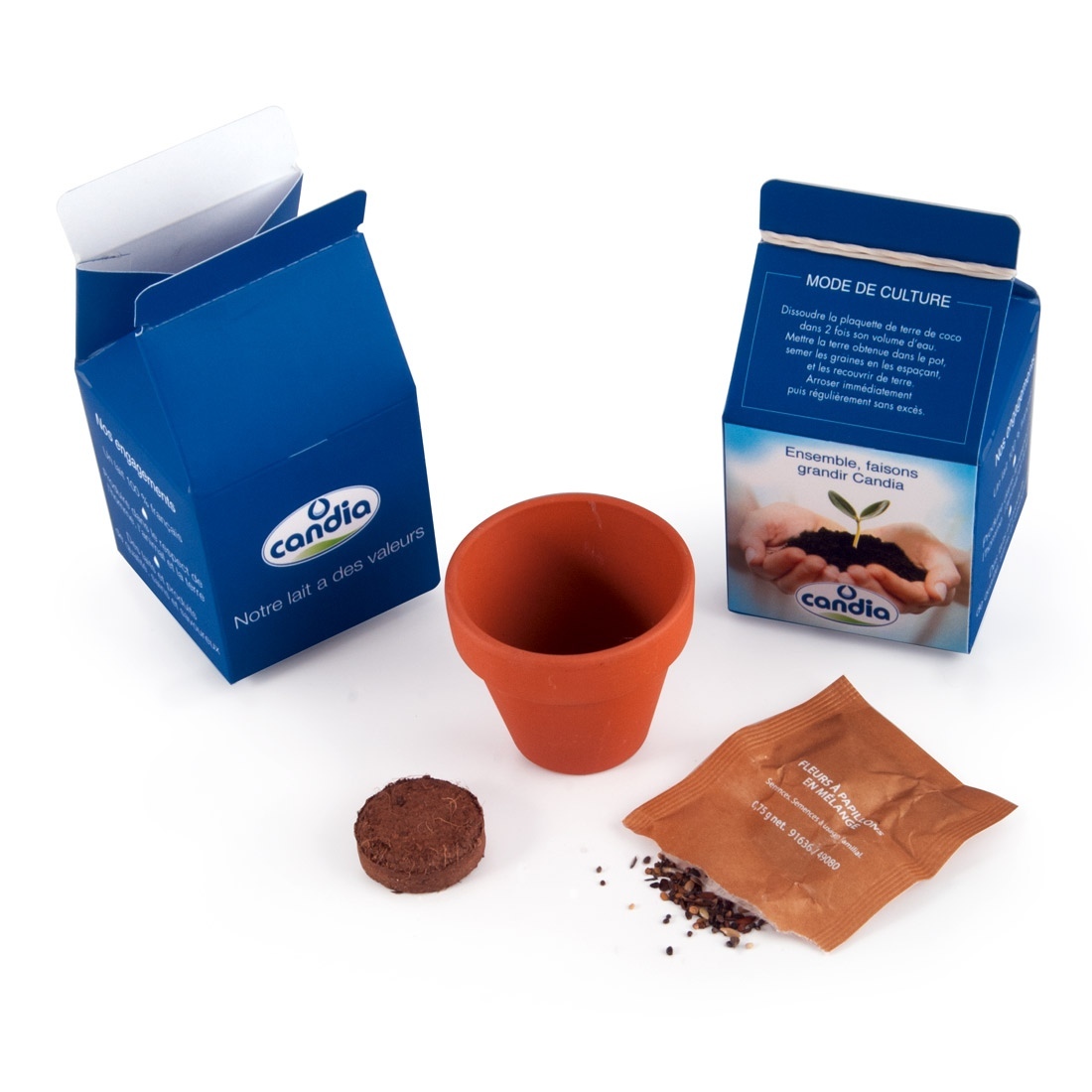 Contenu du kit : Boîte en carton personnalisée en quadrichromie au format 60 x 60 x 110 mm, 1 pot en terre cuite de 55 mm de diamètre, 1 plaquette de terre de coco, 1 sachet de graines au choix parmi les fleurs, légumes ou aromates.