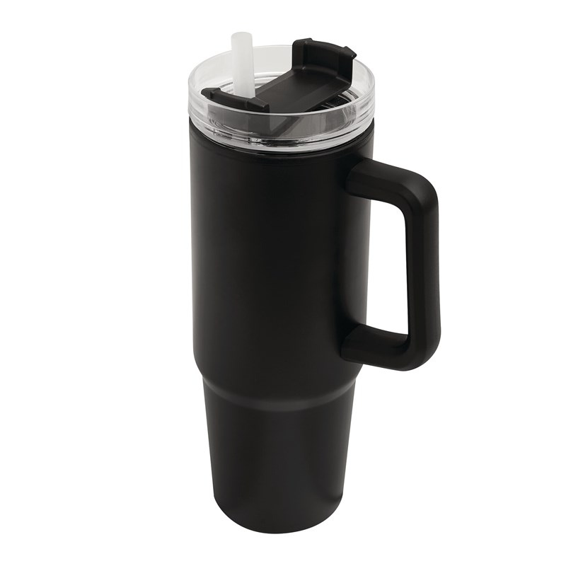 Mug DRINK ULTY , double paroi : plastique à l’intérieur et acier inoxydable à l’extérieur, avec poignée pratique, couvercle en plastique transparent avec bouchon à visser, bague d’étanchéité en silicone, ouverture pour boire avec bouchon à visser et paille transparente, capacité de remplissage env. 900 ml