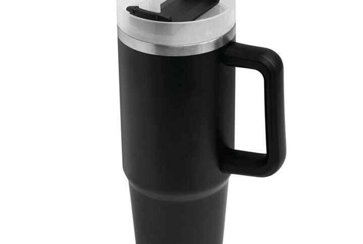 Mug DRINK ULTY , double paroi : plastique à l’intérieur et acier inoxydable à l’extérieur, avec poignée pratique, couvercle en plastique transparent avec bouchon à visser, bague d’étanchéité en silicone, ouverture pour boire avec bouchon à visser et paille transparente, capacité de remplissage env. 900 ml