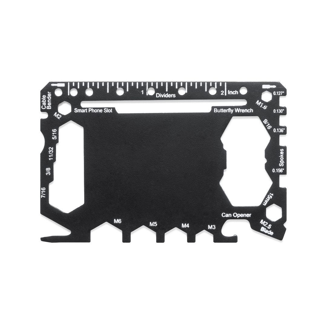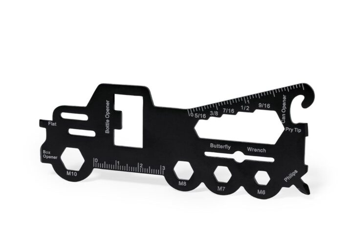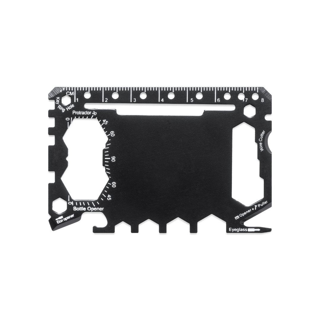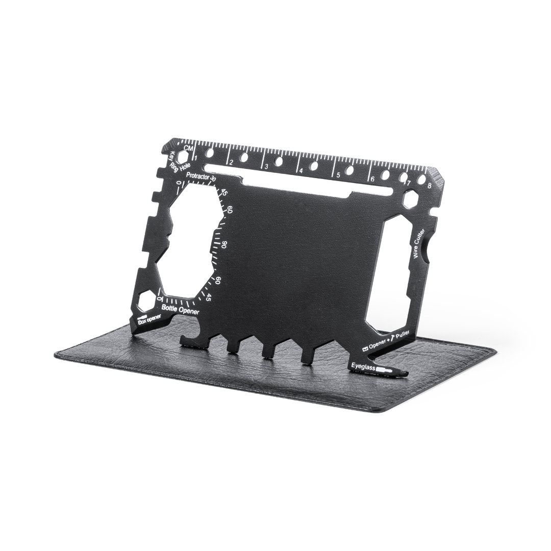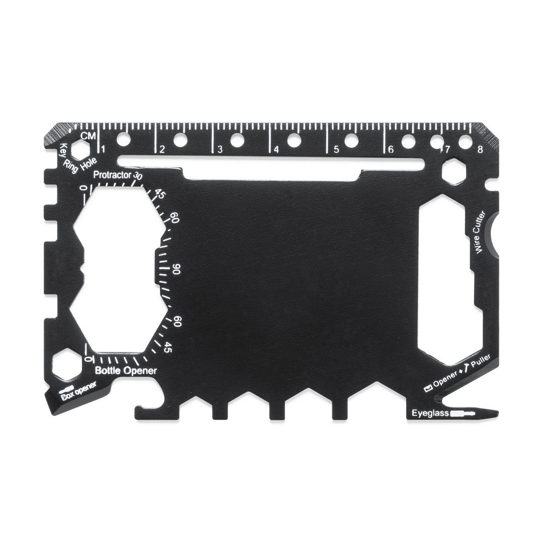 Multitool avec un corps en acier inoxydable résistant et 17 fonctions. Entre autres, les fonctions ouvre-boîte, couteau, tournevis, règle, décapsuleur, clé, clé papillon et rapporteur.
