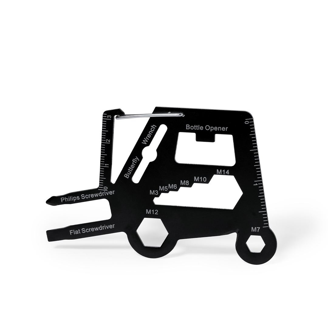 Original et pratique multi-outils en acier inox en forme de taureau mécanique. Avec 16 fonctions, entre autres : tournevis à bout plat et Philips, clé pour écrous hexagonaux en différentes tailles, règle, ouvre-boîte et ouvre-bouteille. En plus de crochet en forme de mousqueton pour un transport facile. Présenté dans un sac en papier recyclé.