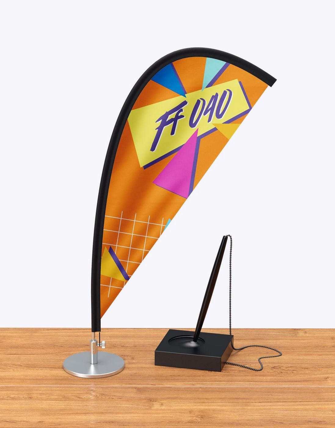 Mini oriflamme de table / flag de bureau personnalisé avec support rond en aluminium. Utilisation intérieure. Voile en matière 100% polyester 115g/m². Impression en sublimation numérique. Impression traversée visible de l’autre côté par transparence. Mât en métal. Sacoche de transport polyester taffetas offerte.Structure disponible sur stock dans notre entrepôt parisien, impression réalisée après validation de la commande