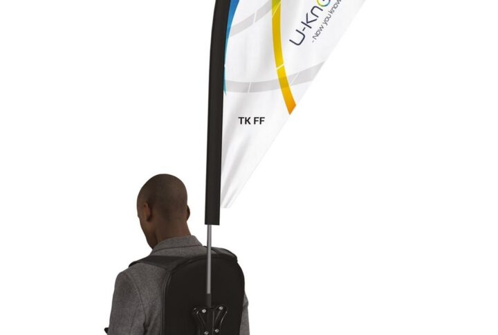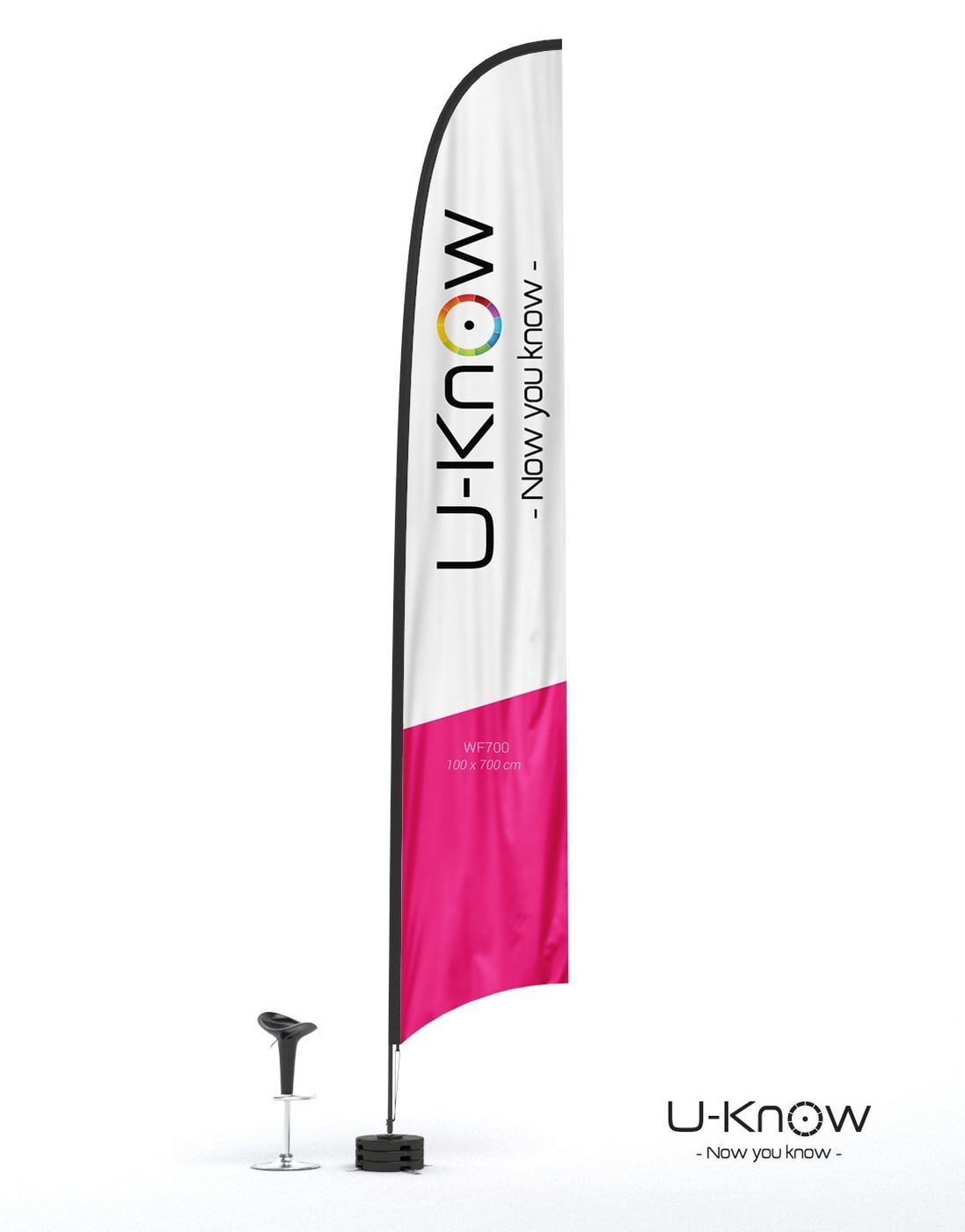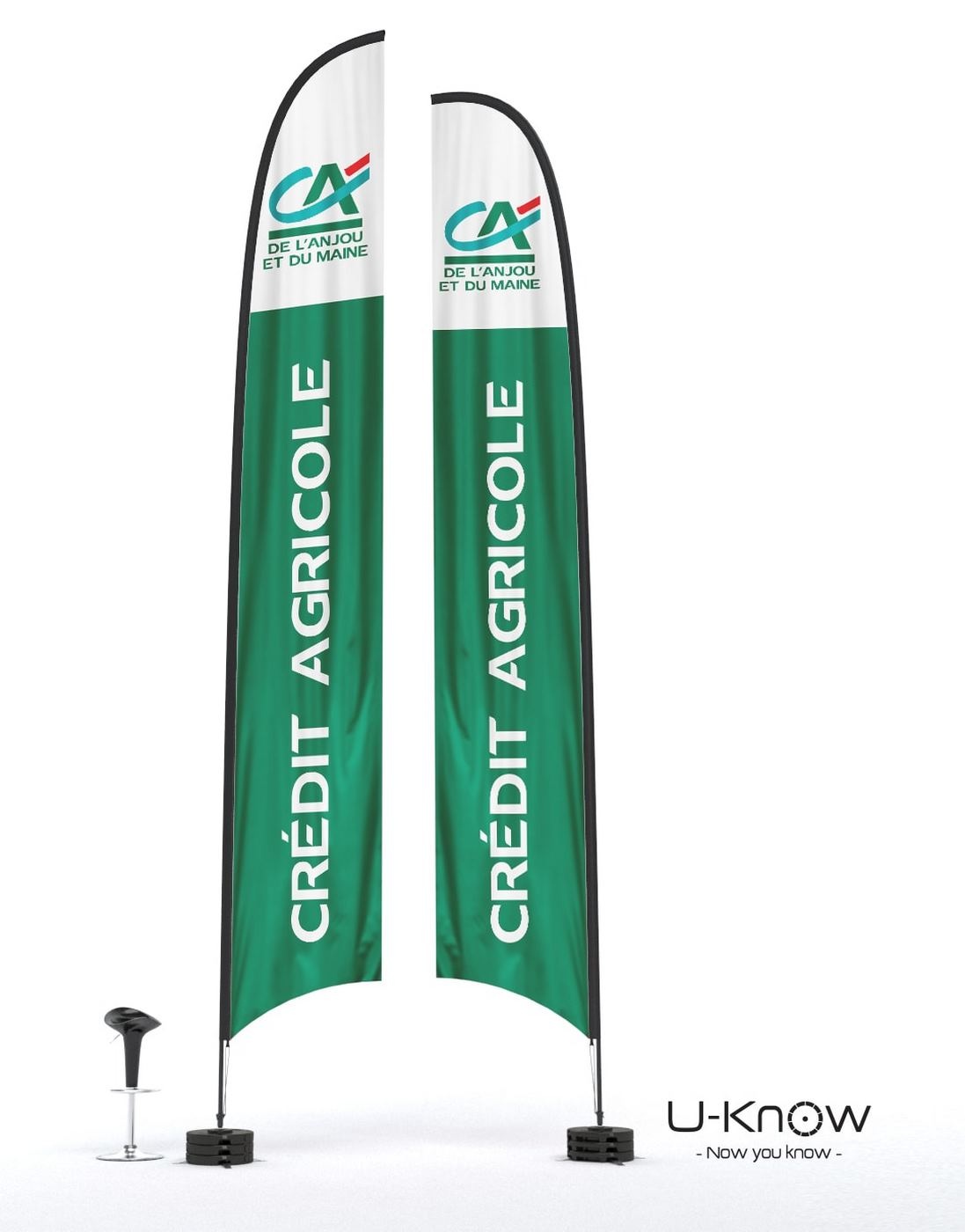 Beach flag en forme d’aile d’avion ou plume de 7m de hauteur. Voile oriflamme en matière 100% polyester 115g/m². Seule une impression recto seule est possible. L’impression est réalisée en quadri numérique et visible au verso par transparence. Le fourreau noir de la voile est renforcé et fabriqué dans un polyester Oxford 300 D. Le mât est en fibre de carbone (très résistant). Le mât se fixe sur le croisillon acier monté sur un axe de rotation spécial à roulement à billes MATP90. Il convient de lester avec au moins 3 socles PVC Béton sans axe de rotation (réf:MATP31) pour obtenir une bonne résistance aux vents pour ces oriflammes géantes. Utilisation extérieure exclusivement. Garanti pour un vent inférieur à 70 km/h..Structure disponible sur stock dans notre entrepôt parisien, impression réalisée après validation de la commande