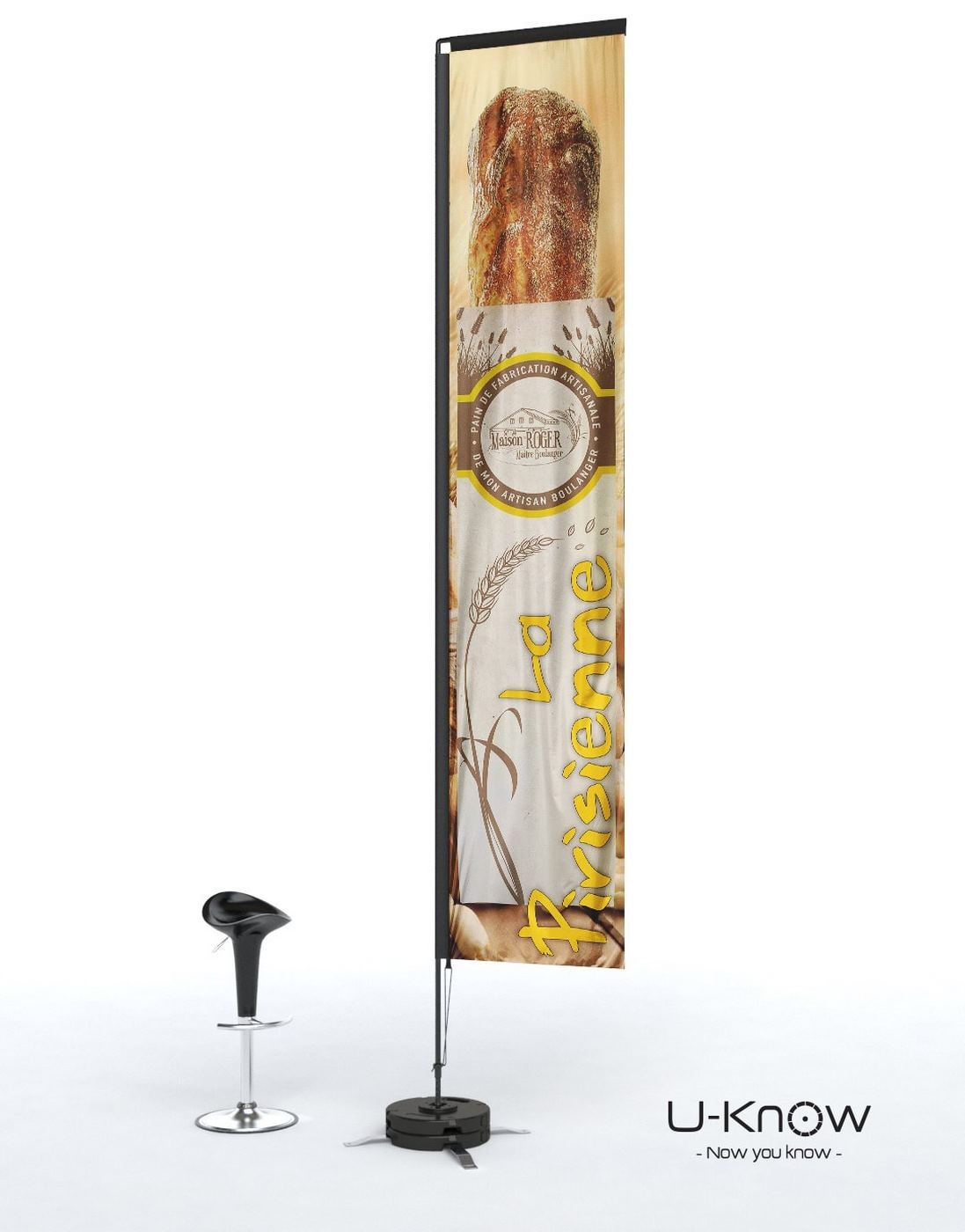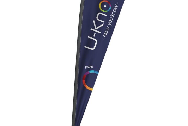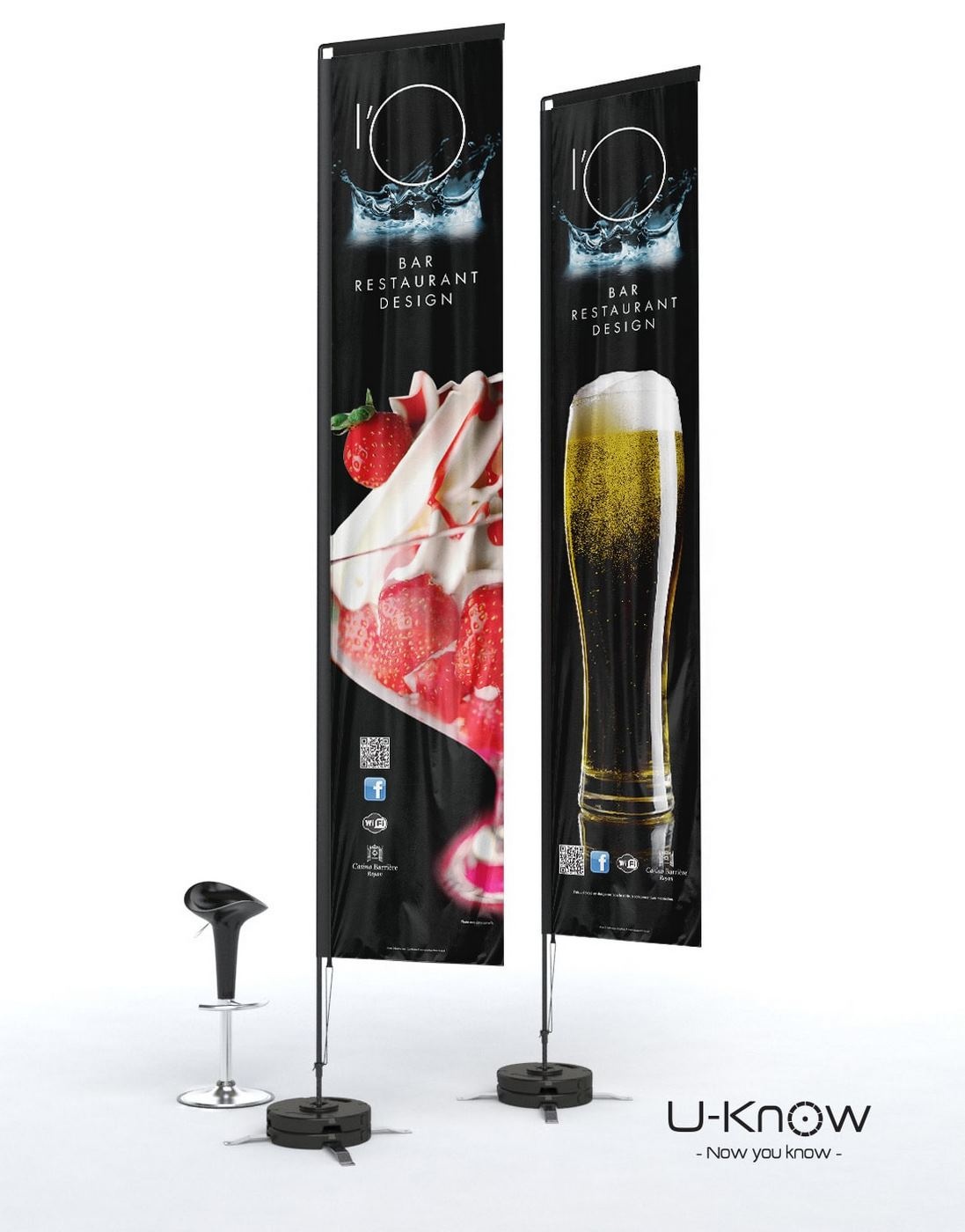 Beach flag en H ou rectangulaire de 4,8m de hauteur. Voile oriflamme en matière 100% polyester 115g/m². 2 techniques d’impressions possibles : numérique ou sérigraphique (MOQ de 50 pcs en sérigraphie). En impression recto seul, le visuel est visible sur l’autre côté par transparence. En impression numérique, il est possible d’imprimer en recto/verso ; une feuille occultante insérée entre les deux côtés permet d’avoir une meilleure lisbilité. Le fourreau noir de la voile est renforcé et fabriqué dans un polyester Oxford 300 D. Le mât est en fibre de carbone (très résistant). Les mâts se fixent sur tous les pieds de la même manière. L’axe de rotation présent sur les pieds pivote à 360°. Les voiles se tendent sur tous les mâts grâce à un élastique. Utilisation intérieure et extérieure. Garanti pour un vent inférieur à 70 km/h..Structure disponible sur stock dans notre entrepôt parisien, impression réalisée après validation de la commande