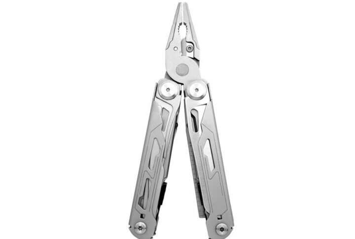 Outil multifonctions professionnel en acier inoxydable hautement résistant (2CR13). Manche en aluminium. Assemblage vissé Torx. 17 fonctions : pince, pince coupante, couteau, décapsuleur, ouvre-boîte, 2 tailles de tournevis plat, assortiment de 9 outils (tournevis cruciformes, plats, clés Allen), dénudeur. Dureté rockwell : 48 degrés. Livré dans un étui gris chiné en RPET.