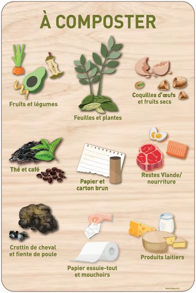Ce panneau apporte des informations et des conseils sur le tri des déchets compostables. Il vous indique ce qui est à composter. Ce panneau est en fond bois et existe dans différentes matières (Aluminium/PVC, PVC, Vinyle) et dimensions (300 x 450 mm, 400 x 600 mm, 420 x 980 mm)