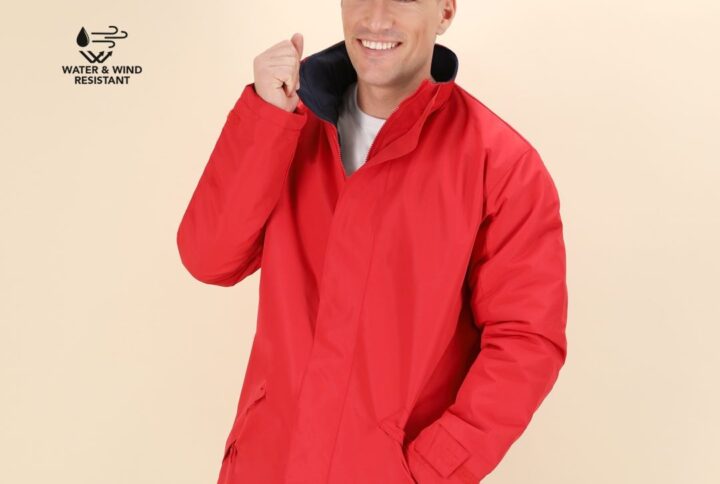 Parka unisexe avec capuche, imperméable et coupe-vent. Doublure intérieure en maille grise foncée, avec capuche réglable à cordon noir et œillets métalliques assortis. Fermeture à glissière inversée à l’avant en noir, avec tirette assortie. Deux poches latérales avec zip noir, tirettes assorties et une poche intérieure. Poignets réglables avec velcro noir.