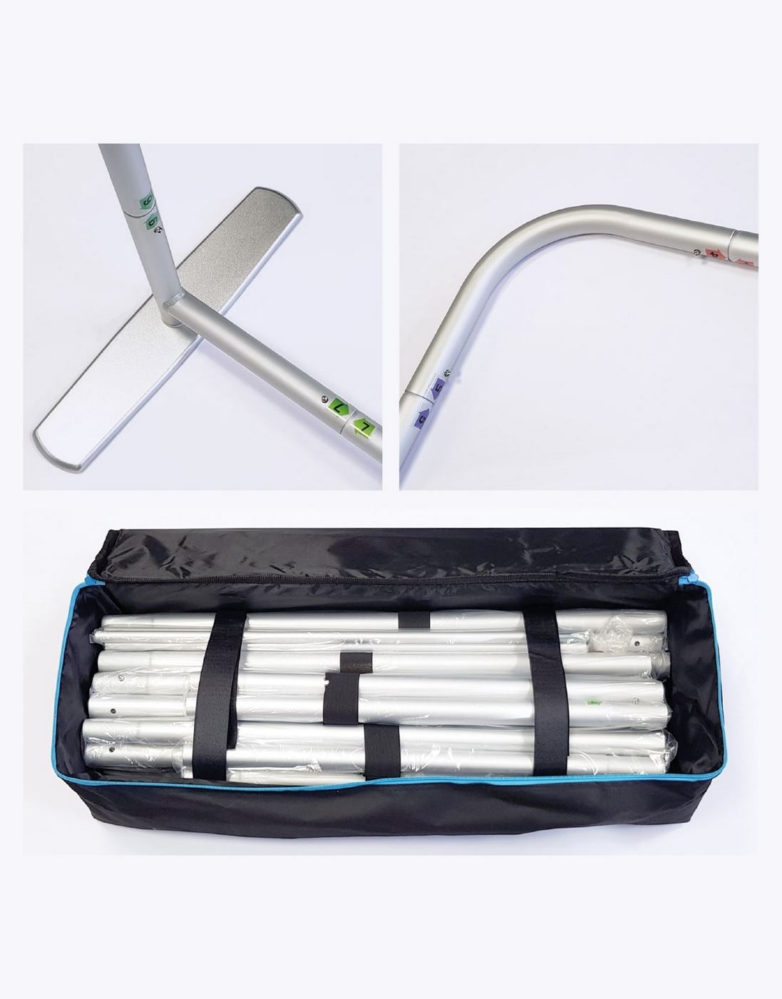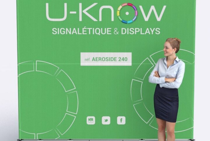 Ce mur d’image ou photocall de dimensions 240(l)x230(h)cm est constitué d’une structure tubulaire en aluminium. Le montage est facile et se fait en 5 minutes : les pictogrammes de couleur permettent d’assembler la totalité de la structure. La toile en polyester 230g/m² traitée anti-feu norme eurpéenne B1 est imprimée en sublimation numérique haute définition en France et se monte ensuite comme une housse. Une impression recto-verso est possible. L’ensemble est livré dans son sac de transport.
