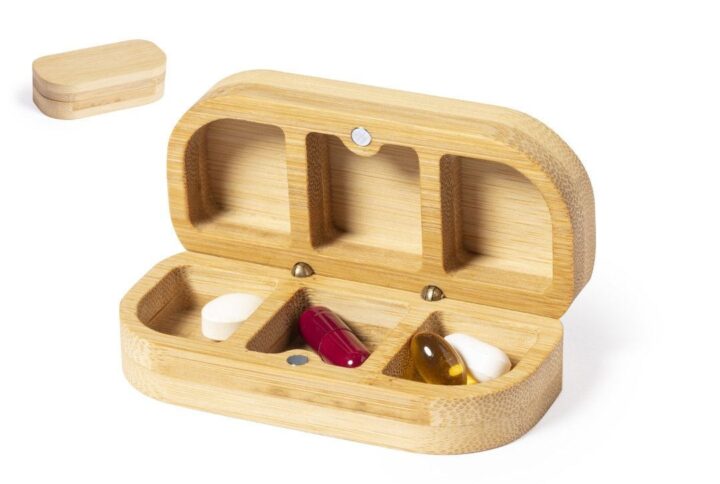 Compact pilulier hebdomadaire. Étui en forme de cylindre avec 7 compartiments différenciés par couleur et sigle pour identifier rapidement le jour de la semaine. Chaque compartiment est divisé en 4 cases séparées correspondant à chaque partie de la journée. Présenté individuellement dans un sac recyclé.