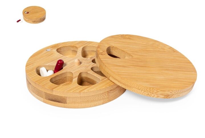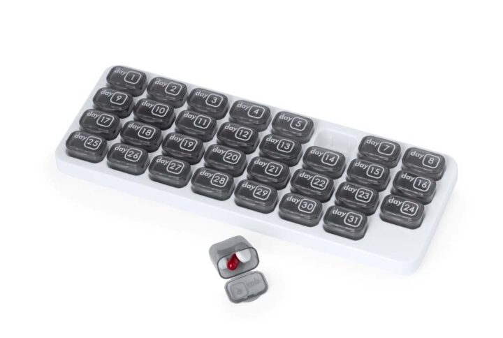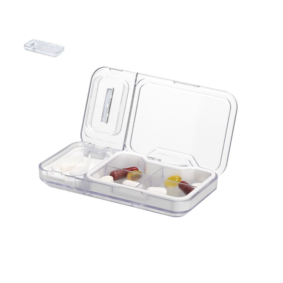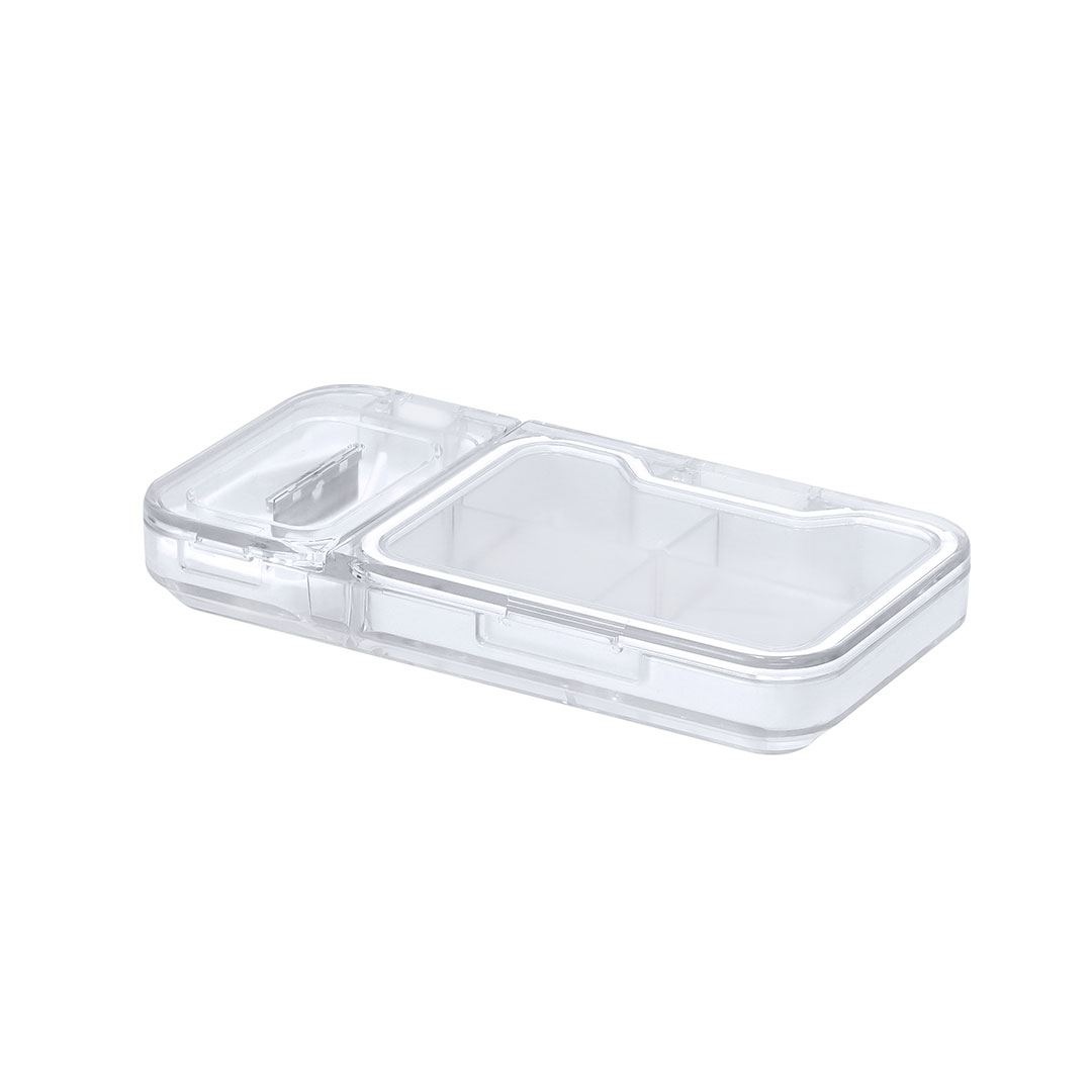 Organisateur de médicaments avec 4 compartiments intérieurs, fermeture de sécurité avec bords en silicone et lame pour couper les médicaments. Fabriqué avec une finition transparente.