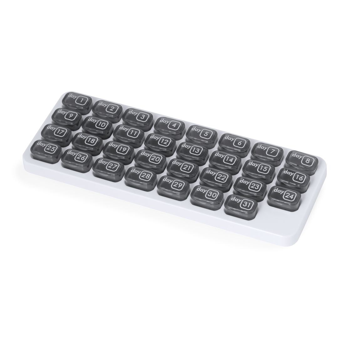 Boîte à pilules mensuelle originale en PP résistant. Organisateur de 31 cases indépendantes et amovibles pour stocker tous les comprimés nécessaires jour après jour. Élégante base blanche et des cases grises avec le jour du mois marqué. Présenté dans un sac individuel.