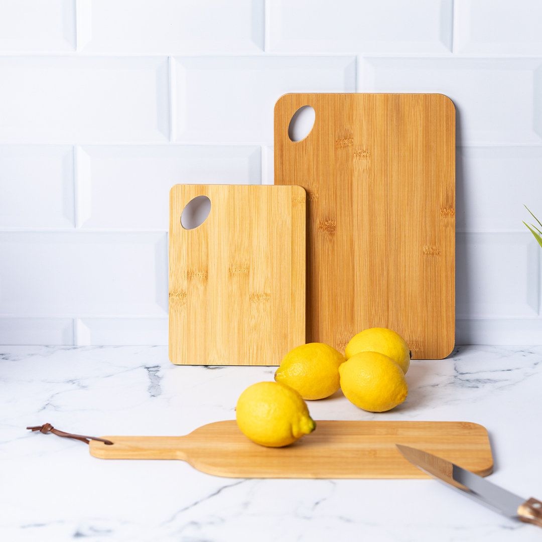 Table en bambou, finition polie douce et résistante. Idéal pour couper et pour une présentation. Avec poignée pour une manipulation facile et cordon à accrocher sur simile de cuir.