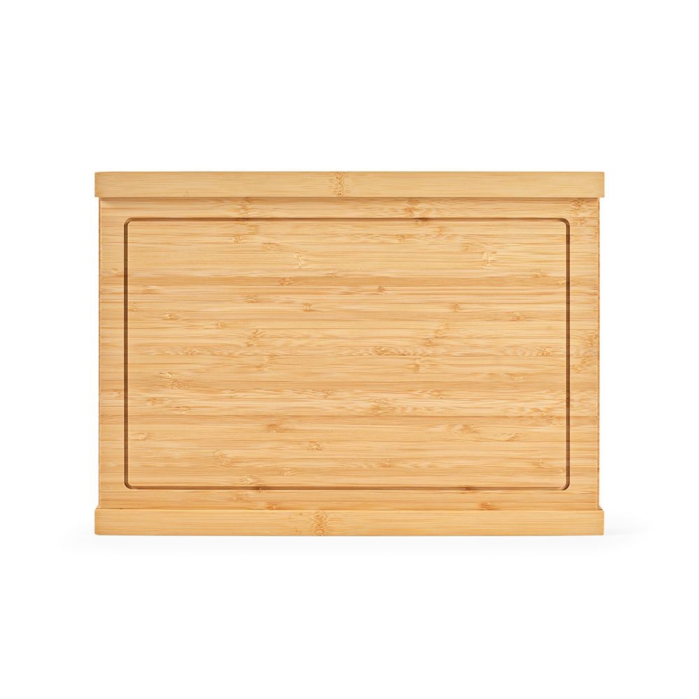 Voici une remarquable planche en bambou. Avec des dimensions de 28 x 39 x 4,5 cm et une rainure sur son pourtour, elle renferme un secret : un plateau coulissant avec trois couteaux de cuisine. Elle est livrée dans une boîte individuelle en carton recyclé.