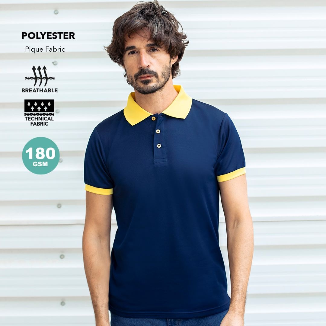 Polo technique en matière 100% polyester piqué de 180g/m2. Fabriqué en tissu respirant confortable et doux, avec des ouvertures latérales sur le bas. Design original en bleu marine, avec col et détails de manches dans un ton contrasté et assorti. Avec 3 boutons de fermeture élégants, assortis au col et aux détails des manches. Disponible en différentes couleurs et tailles XS, S, M, L, XL, XXL.