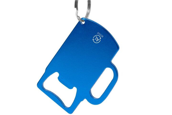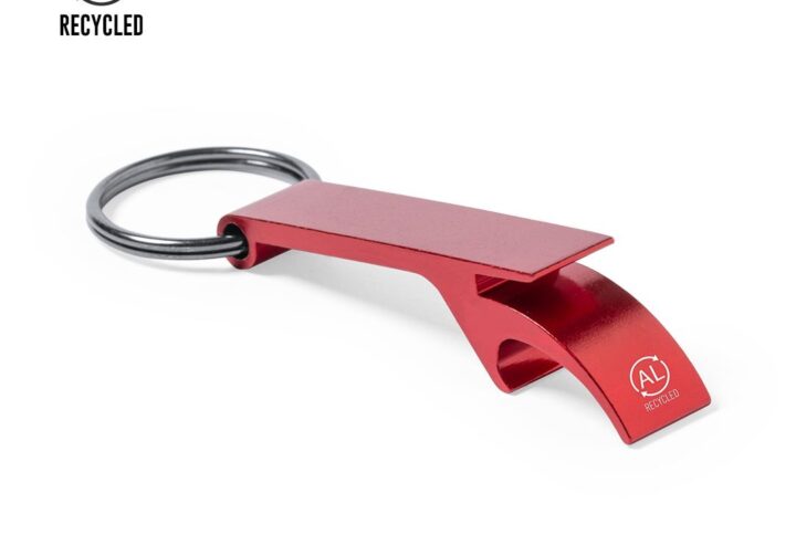 Porte-clés ouvre-bouteille en aluminium recyclé. Inclut un distinguo d’aluminium recyclé. L’aluminium recyclé est un matériau avec des possibilités de recyclage presque infinies, sans perdre ses propriétés d’origine et consommant moins d’énergie dans ce processus.Certification GRS (Global Recycled Standard / Standard de Recyclage Mondial), qui garantit l’origine recyclée du matériau utilisé pour fabriquer le produit.