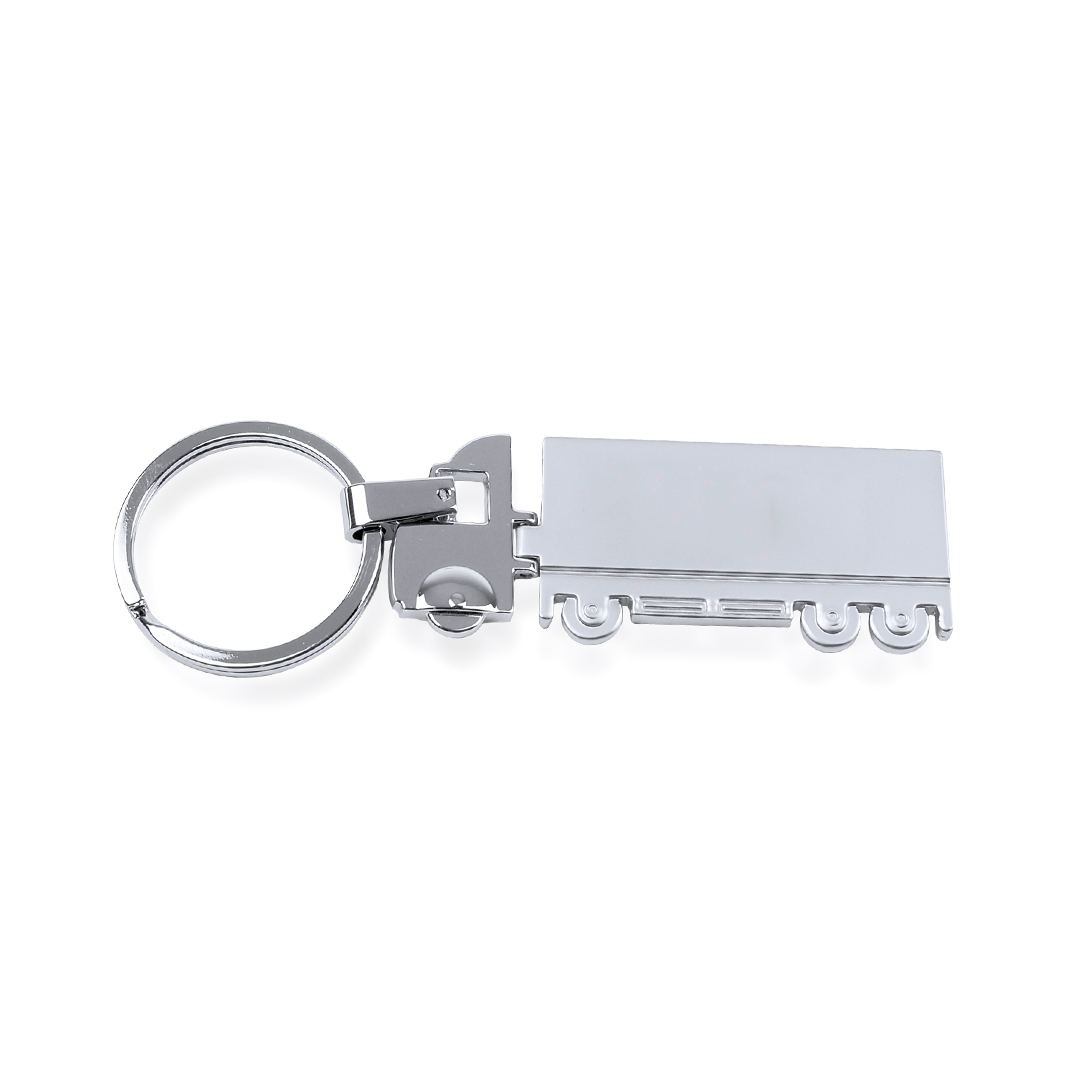 Porte-clés métallique en forme de camion, idéal pour le marquage laser. Cabine du camion en finition brillante et remorque en finition mate.