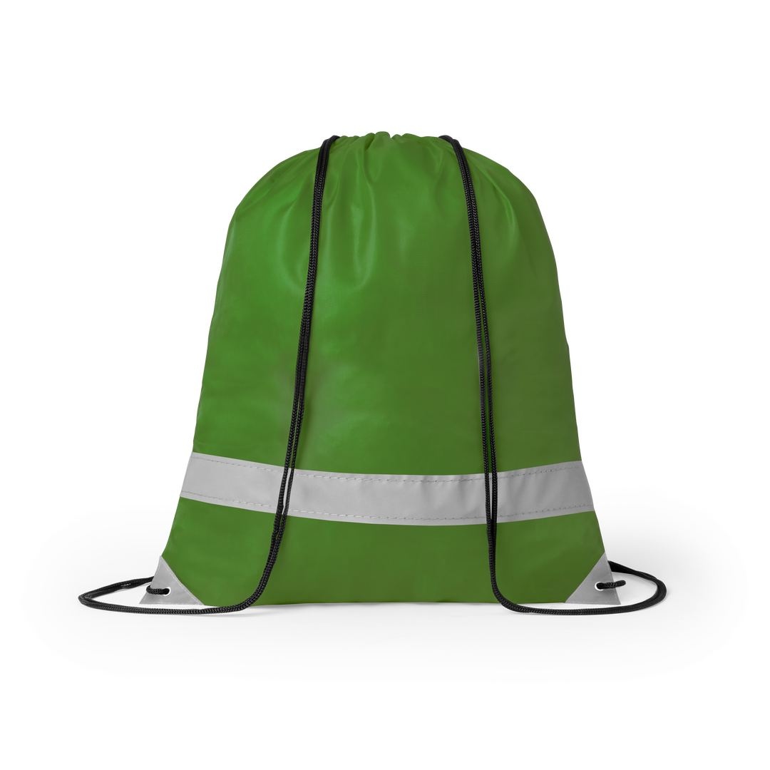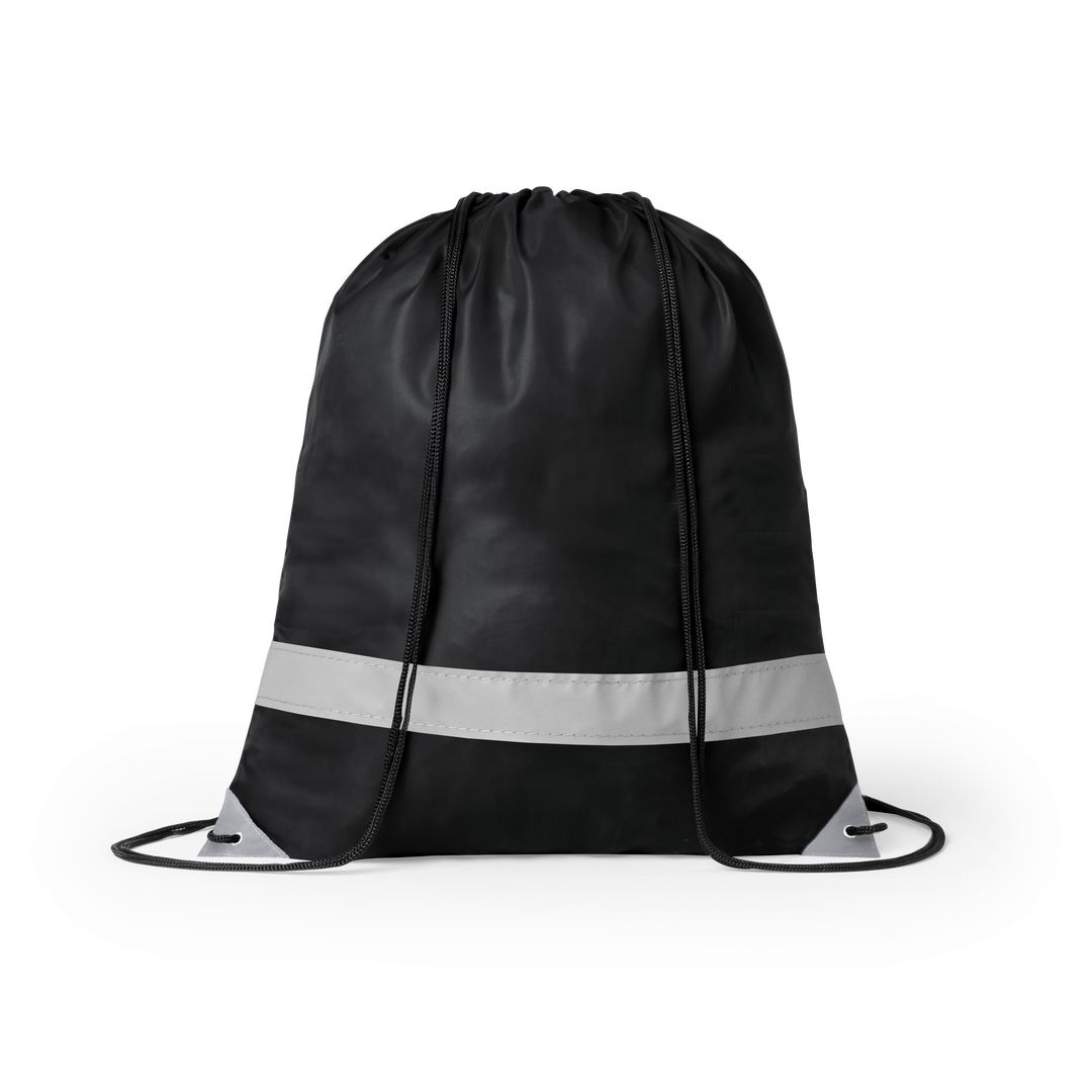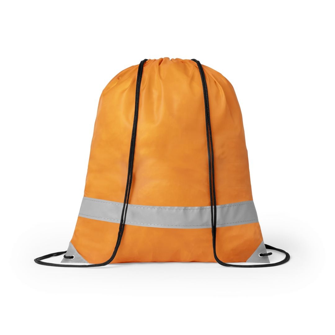 Sac à dos en polyester 90T aux couleurs vives, avec bande à l´avant. Cordes noires à fermeture automatique et coins renforcés par des œillets métalliques.