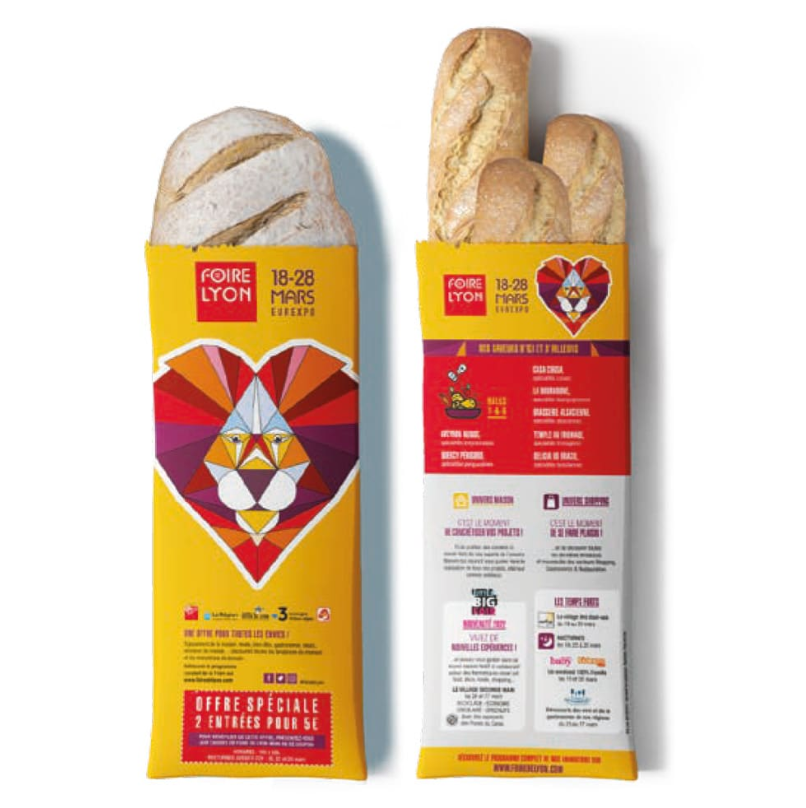 Il s’invite au cœur de tous les foyers sans même passer par la boite aux lettres, il est utile, communicant et on le regarde 4 à 5 fois par jour… Distribué par les boulangeries, le sac à pain personnalisé permet un ciblage géographique précis : National, régional ou local. Communiquez autrement avec un objet malin et peu coûteux. Sacs 100 % personnalisables impression quadri