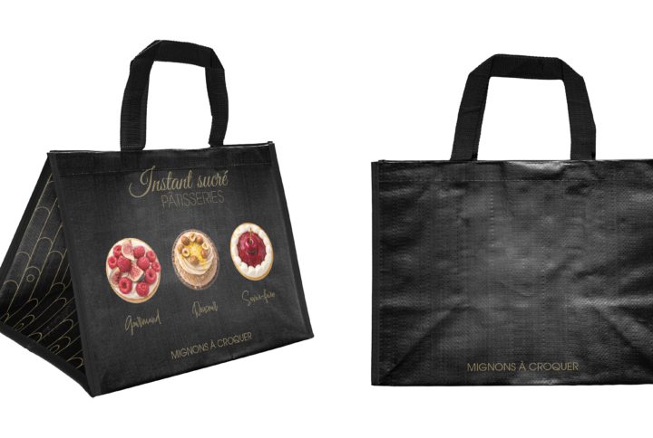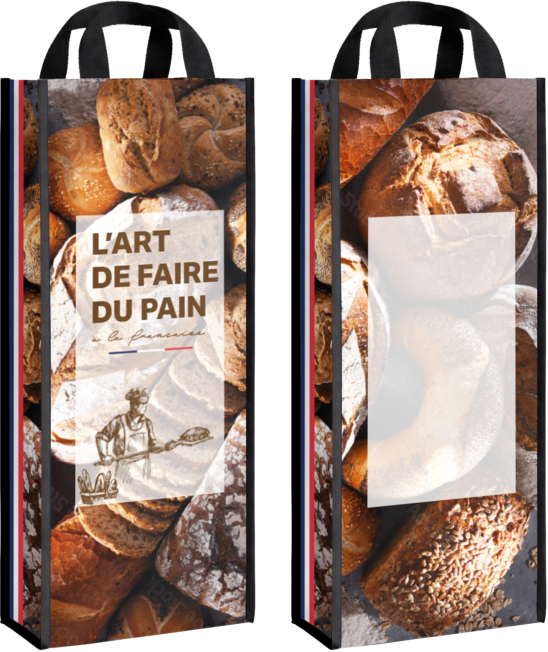 Sac à pain spécial Boulangerie, 100% polypropylène non-tissé pelliculé 120 g/m², 2 anses courtes en polypropylène tressé. Dim : 250 + 80 x 650 mm. Recto avec visuel déjà imprimé, verso à personnaliser avec votre logo (140 x 300 mm max)