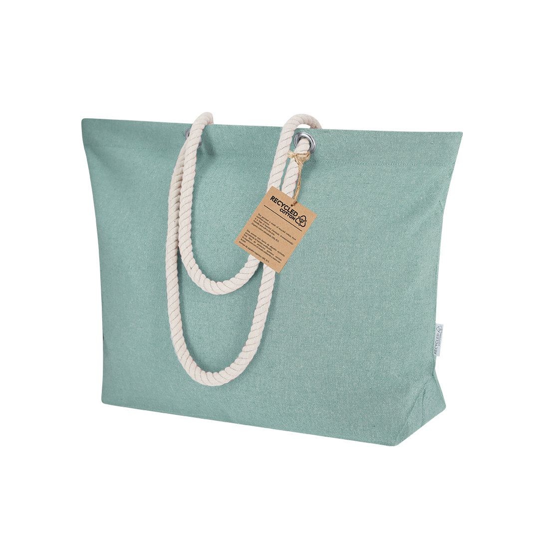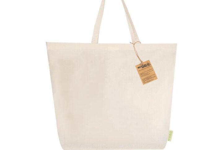 Sac confectionné principalement en coton recyclé de 220g/m2. Avec soufflet et poignées longues en coton en couleur naturelle et design tressé. Inclut le label de coton recyclé.