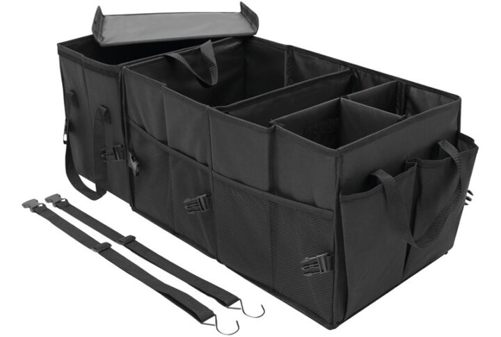“Sac de coffre CAR ASSISTANT: grand intérieur, couvercle avec fermeture velcro, poignée de portée et 2 poches filet à l´avant, fixation sécurisée dans le coffre avec fermeture velcro en bas et à l´arrière