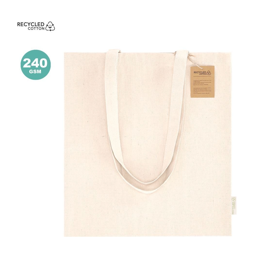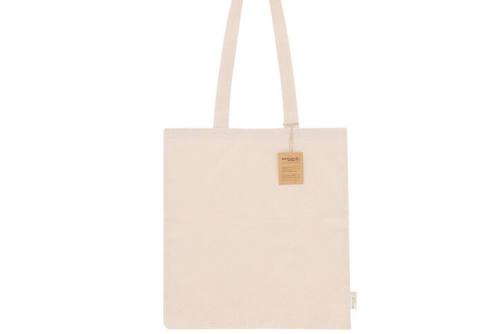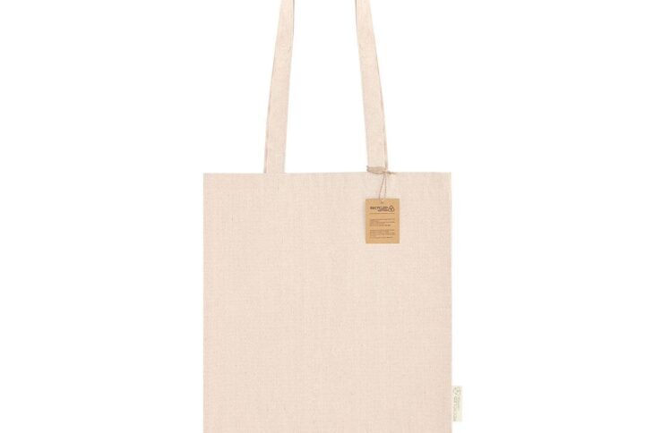 Sac confectionné principalement en coton recyclé de 240 g/m2. Longues poignées de 70cm avec renforcement, finition cousue. Logo en étiquette latérale et résistance jusqu’à 7 kg de poids.