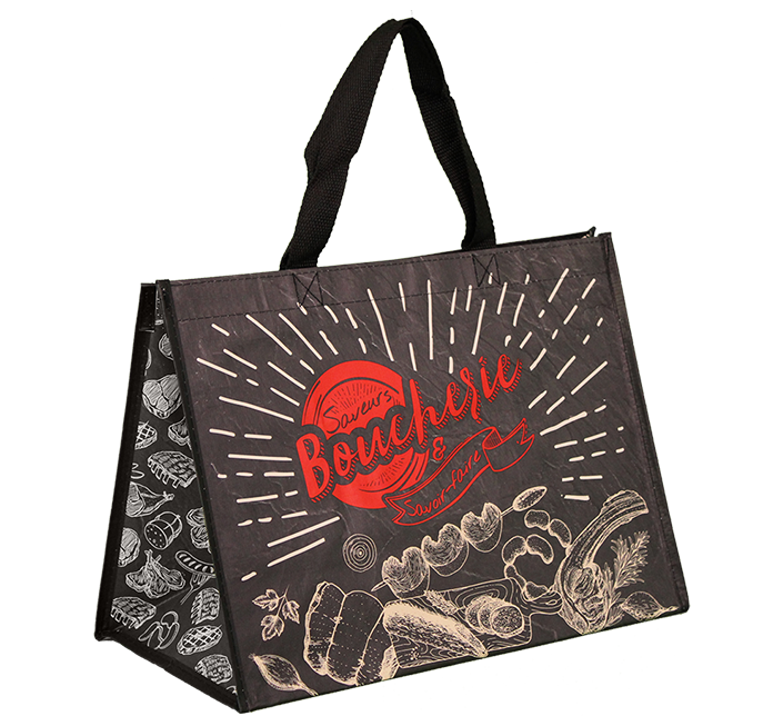 Sac spécial Fromagerie, 100% polypropylène non-tissé pelliculé 140 g/m², 2 anses courtes en polypropylène tressé. Dim : 360 + 300 x 270 mm. Recto avec visuel déjà imprimé, verso à personnaliser avec votre logo (300 x 200 mm max)
